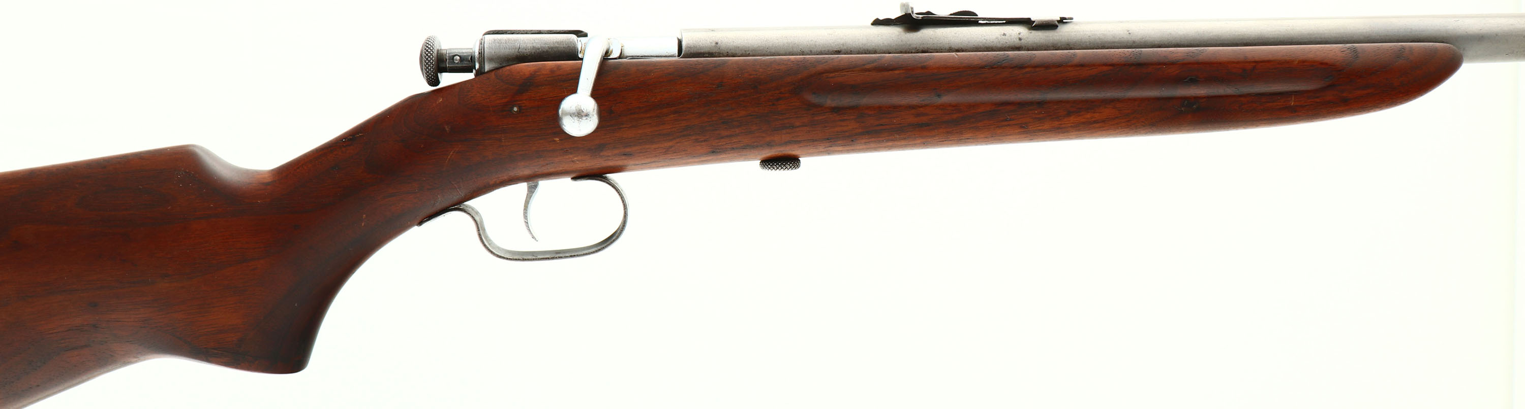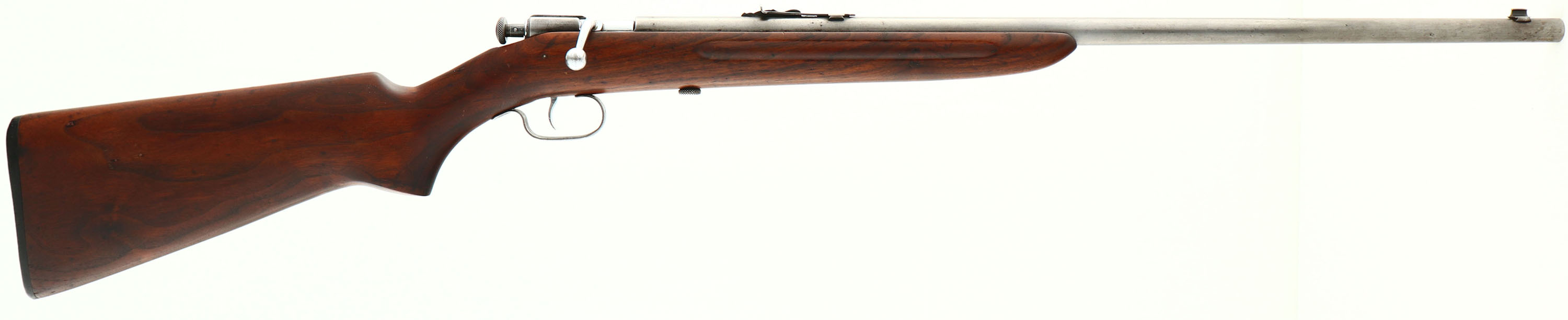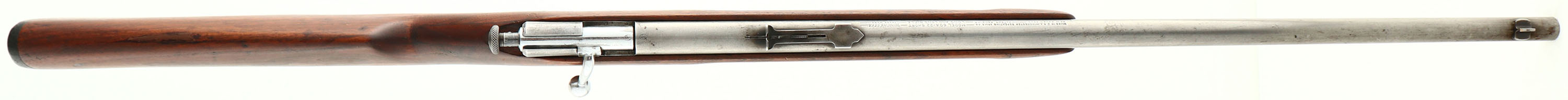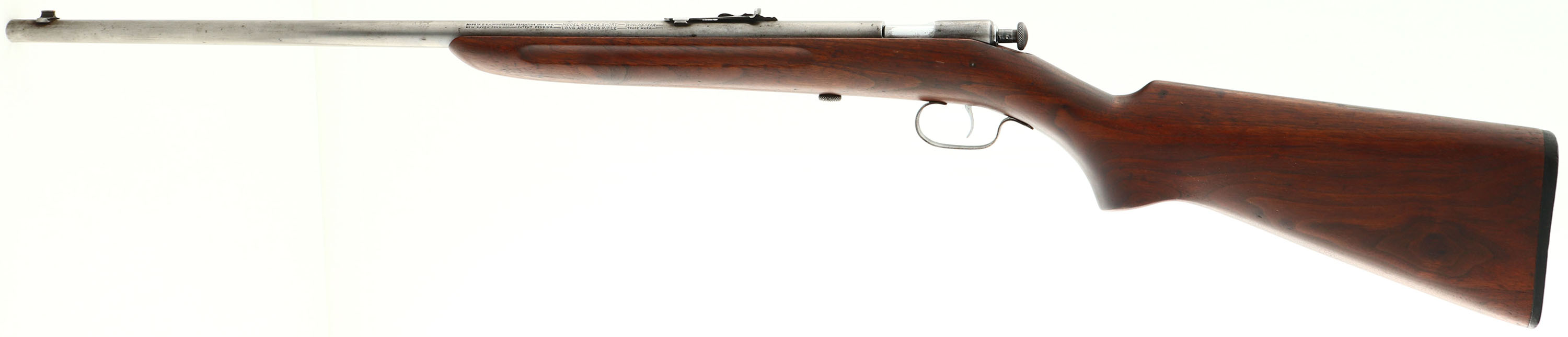 Winchester, Model 60A Sporting, CAL: 22 S,L,LR, MFG: 1932-39, SN: NONE, Bolt Action Rifle, 23'' barrel. Rarer early production rifles carried the shorter 23'' barrels & finger grooved stocks & are desired amongst collectors. The finger groove, flat pistol grip wood stock is very good, having been sanded & reoiled. The top of the comb has some fill & there is a spliced wood repair at the flat edge of the pistol grip. There remains minor contusions, surface scrapes & light scratches. The metal finish has fully worn a gun metal gray. Bore is excellent & bright. Factory sights. Buttstock carries a Winchester marked, checkered black plastic buttplate. FFL or C&R Req. - Value: 200 to 400