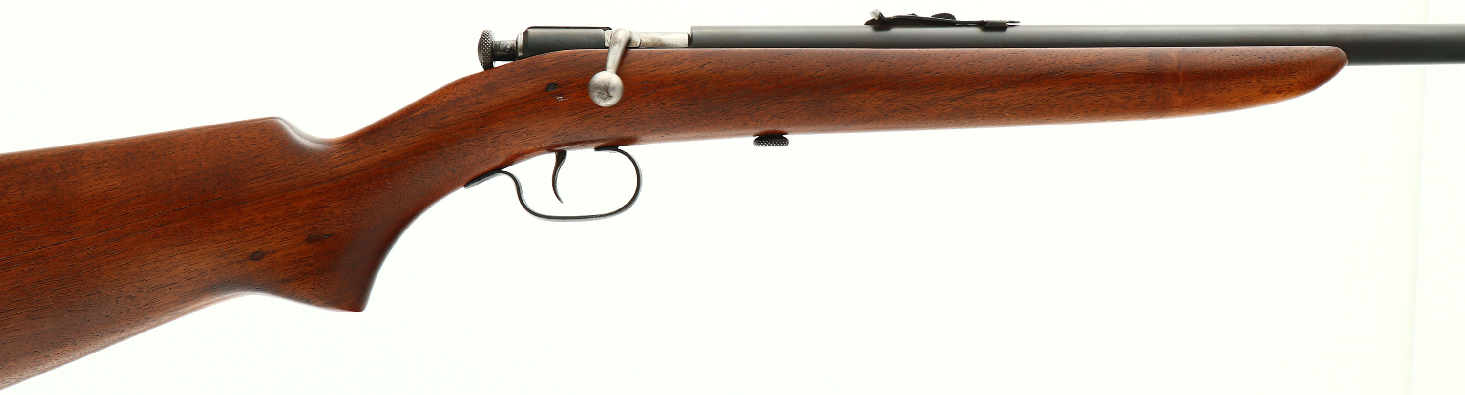 Winchester, Model 60A Sporting, CAL: 22 S,L,LR, MFG: 1932-39, SN: NONE, Bolt Action Rifle, 23'' barrel. This is a later production rifle, with the non-finger grooved stock. The flat pistol grip wood stock is good & soild, after having a crack repair that utilized 6 pegs, two at each side of the pistol grip & two on the flat of the pistol grip. Crack is no long visible after the stock was lightly sanded & refinished. There a few minor contusions, surface scrapes & scratches to the finish. The metal was cold blued previously & is now showing areas of wear & a brown patina. Bore is excellent & bright. Factory sights. Buttstock carries a Winchester marked, checkered black plastic buttplate, with some edge chipping. FFL or C&R Req. - Value: 200 to 400