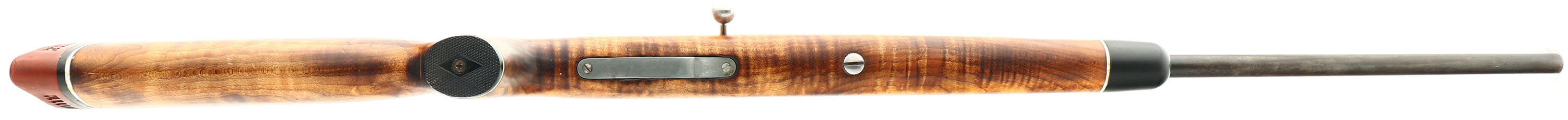Springfield (J. Stevens Arms Co.), Model 83, .22 S, L, LR Cal., MFG. 1935-38, SN: None, Bolt Action Single Shot Rifle, 24'' round barrel. The capped pistol grip wood stock is a replacement, which rates very good. The stock has a white-line buttend, pistol grip cap & black tip forend. The stock has been sanded & very nicely refinished, with rippled grain & tiger stripped cross grain. There a very few minor scrapes contusions. The original metal blue finish rates 30% on the barrel, with the balance on the barrel & receiver toned to a brown patina, with some speckling. Bore is very good & bright. The barrel caries an adjustable rear & front blade sight. The receiver & barrel each have two empty holes from previous scope mount. The stock carries a period ventilated recoil pad. Nickeled bolt, bolt handle & trigger. FFL or C&R - Value: 150 to 300