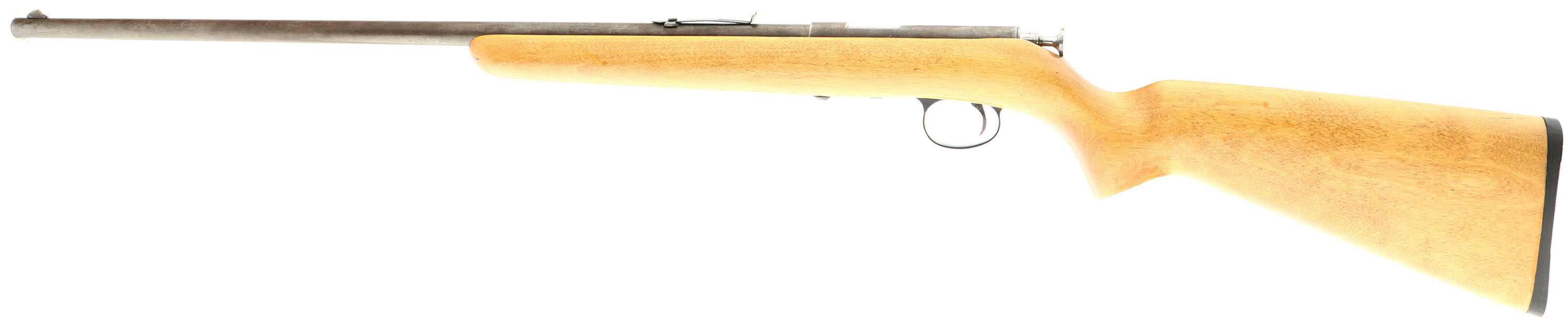 Sears Ranger (Marlin), Model 103-8 SMOOTHBORE, Marked .22 S, L, LR Cal., MFG. 1936-41, SN: None, Bolt Action Single Shot Rifle, 24'' round barrel. The original flat pistol grip wood stock is excellent, having been lightly sanded & nicely refinished. There are very few minor scrapes or scratches remainging. The metal blue finish has worn gun metal gray, with a very thin brown patina. The smoothbore is very good & bright. The barrel carries an adjustable rear missing the elevator & front blade sight. The stock carries a replacement buttplate. Missing sling studs. A nice looking vintage .22 smoothbore rifle. FFL or C&R Req. - Value: 100 to 200