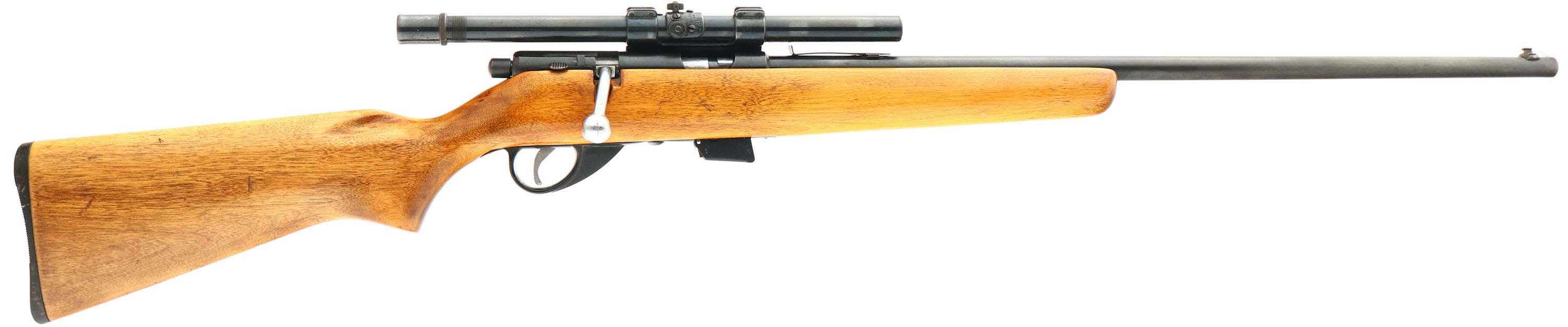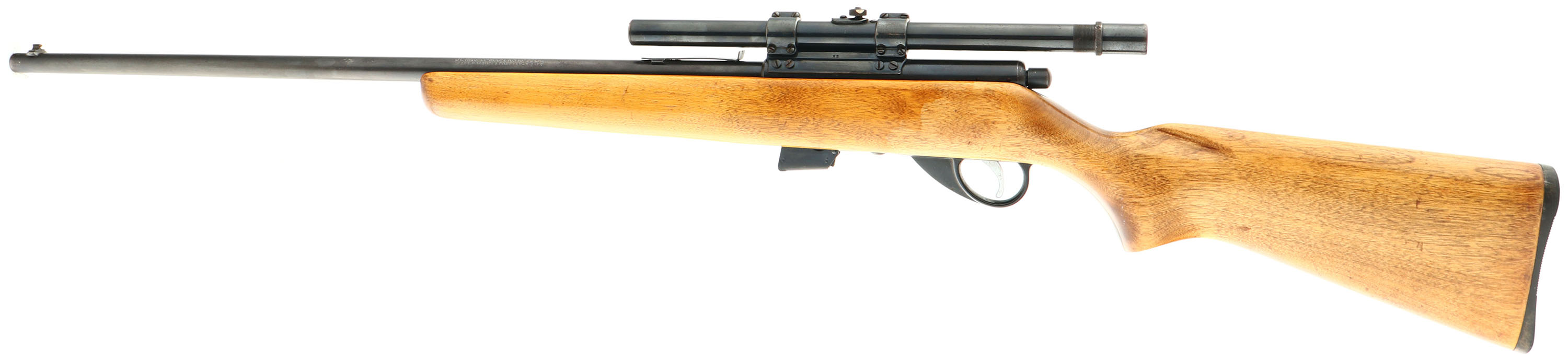J.C. Higgins (Sears), Model 103 16 (Marlin 80), Marked .22 S, L, LR Cal., MFG. 1946-62, SN: None, Bolt Action Rifle, 24'' round barrel. The original flat pistol grip wood stock is excellent, having been lightly sanded & refinished. There remains several minor scrapes, scratches & contusions. The original metal blue finish rates 85% overall. The bore is excellent & bright. The receiver is mounted with a Weaver G6 small bore scope on a N2 mount, while the barrel carries an adjustable rear missing the elevator & front blade sights. The stock carries the original plastic buttplate. Detachable mag. Nickeled bolt, bolt handle & trigger. FFL or C&R Req. - Value: 150 to 300