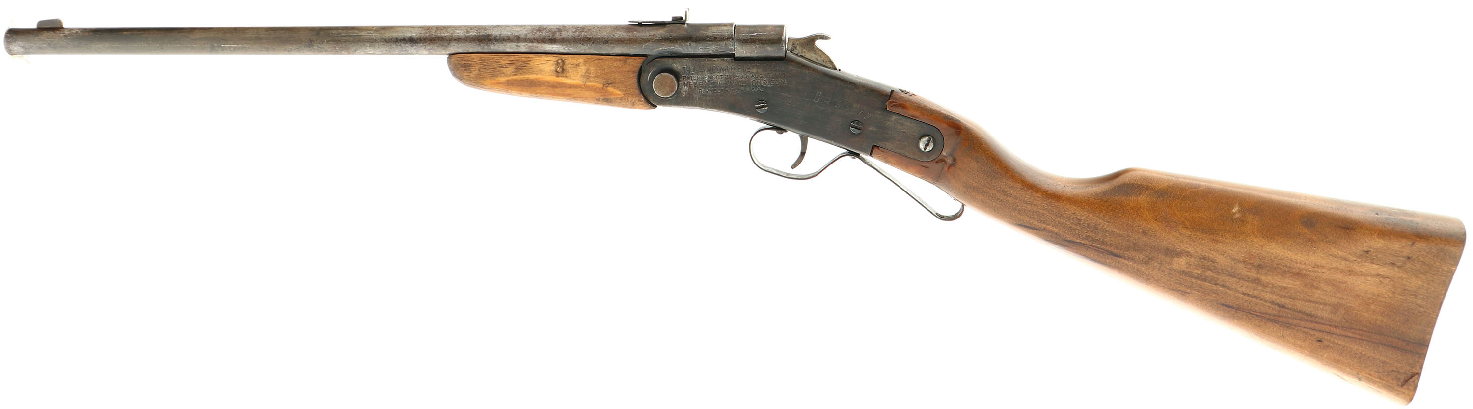 C.J. Hamilton & Son, Model The Hamilton Rifle No. 27 (USA produced version), .22 LR, MFG 1907-30, Single Shot, Tip-up Break Action Rifle, SN: none, 14 7/8'' round barrel. 29 1/2'' overall length. Circa 1906 through 1940's Cloverine Salve ran ads in comic books & newspapers asking kids to sell their salve & offering awards for the amount of product sold. The prizes include such pieces as this Hamilton rifle, a Red Ryder BB gun, toys & more. One of the first rifles offered in the Cloverine ads was the Hamilton Model 27 rifle. Other companies duplicated these award driven sales opportunities for kids selling magazines, seeds & other household items. The replaced flat board, straight grip, walnut stained birch stocks are very good & solid. The stock has a long area of fill behind the trigger guard. The stocks have a few minor of scratches & contusions to the very good finish. The metal has worn to a mix of gun metal gray & thin brown patina, with some remains of original blue mixed in. Some light pitting & speckling. The sides of the receiver & on the barrel have been electric pencil engraved with a 7 digit number. Receive screw & nut holding on the stock is a replacement. Steel rolled barrel over brass bore liner, 6 groove bore with 1 turn in 15''. Bore is good. Blade front & early rear sight combination. ''S'' shaped trigger guard, with replacement screw. No buttplate style. FFL or C&R Req. - Value: 50 to 150