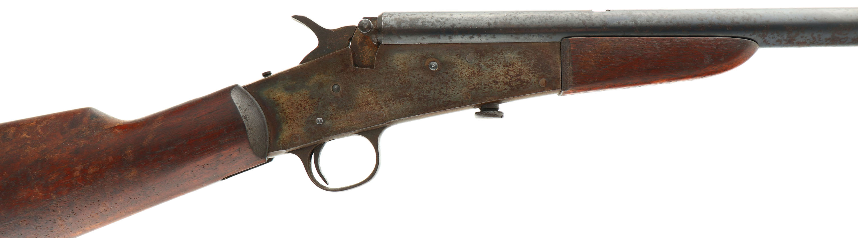 Remington U.M.C., Model 6 SMOOTHBORE, CAL: .32 Short or Long RF, MFG: 1912-33, SN: S-353732, Single Shot Falling Block Rifle, 20'' barrel. Although this model started production in 1901, this rifle was produced after 1912 when Remington & UMC consolidated, as stamped on the side of the receiver. The straight grip wood stocks are good & solid, despite a 2'' crack the both the top & bottom of wrist. There are light scratches, scrapes & contusions to the original finish, along with one larger missing chunk of wood from the left side fo the forend. Matching SN on stock & barrel. The metal blue finish on the barrel 80%, but fully covered with lots of spotty areas of pitting. The case-hardened receiver still displays mutted case-colors. Bore is poor, with large areas of deep pitting & scarring. Small blade front sight, but open dovetail missing fixed rear sight. Remington-UMC smooth metal buttplate. FFL or C&R Req. - Value: 50 to 150