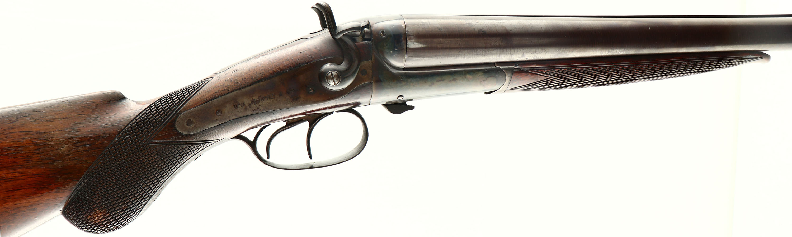 William Moore & Co., Bank/Coach Gun, CAL: 10GA, MFG: 1854-74, SN: NONE, Sidelever Break Action SxS Shotgun, 20'' Laminated Steel barrels. The side plates are marked ''Wm MOORE & CO''. The barrel rib is marked ''LAMINATED STEEL''. The original checkered round knob stock & forend are excellent. There are contusions, scratches, scrapes & thinning finish on the belly. There appears to be finish added at one point in time, possibly lightly sanded due to the buttplate being slightly oversized. There is no other evidence of being refinished. The browned finish on the laminted steel barrels is excellent. There are a couple small spots of scabbard or sheath wear on the sides of the barrels at the muzzle & chamber. The case-hardned frame & side plates retains excellent case-colors. The tang & right side plate were most likely handling points & have more wear than the other case-colored areas, exposing metal gray. There is a layer of laquer over top of the metal surfaces. Some companies were known to do this to help preserve the finishes. Bores are excellent. Brass bead front sight. Factory carved & checkered buttplate with multiple small cracks. Double triggers. Mechanically excellent. LOP: 13 3/4''. A high condition example of what is known as a ''Bank Gun''. Antique, No FFL Req. - Value: 1000 to 2000