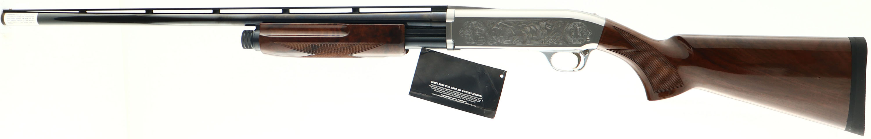 CASED Browning, Model BPS Engraved DU shotgun, 20 Ga., MFG. Modern, SN: 00961DU099, Pump Action Shotgun, made in Japan, 26'' Matted Vent Rib barrel, take down, Interchangeable invertor choke tube system with all three chokes, 2 3/4'' - 3'' shells, High grade walnut glossy checkered stocks are near Mint, with flat knob pistol grip, factory solid black buttpad, Metal blue is 100%, with distinctive silver engraved receiver that pictures Mallards setting in on both sides, Bore is mint, NIB, bright & shiny, Bottom eject (great for left or right handed shooters), Thumb safety, 14 1/2'' LOP over pad, Comes with correct factory case with lock, wrench & paperwork, Here is your chance to buy a near mint BPS that has been out of production for 25 yrs. FFL Req. - Value: 800 to 1600