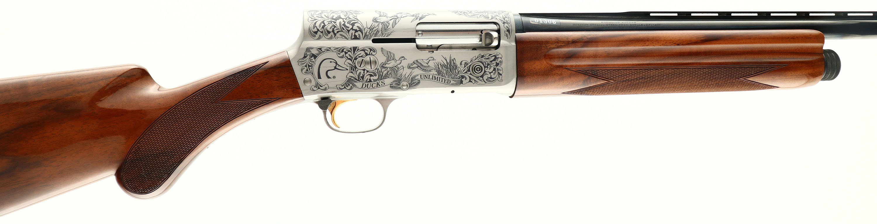 Cased Browning, Auto-5 Ducks Unlimited Light Twenty CAL: 20 GA, MFG: 1990, SN: 90DU001306, Semi-Auto Shotgun, Invector Choke System, 2 3/4'' chamber, 26'' Ventilated matted ribbed barrel. Ducks Unlimited Special Edition. The Miroku factories in Japan built 5,000 of these Auto-5's. Featuring elaborately engraved silver coin receiver & fancy checkered walnut stocks. The words ''DUCKS UNLIMITED'' & ''LIGHT TWENTY'' are engraved in banners across the sides of the receiver, along with numerous ducks in hunting scenes. Engraved trigger guard. Engraved & signed by T. NAGANOI. Both wood & metal finishes are as excellent. Bore is excellent. Barrel holds a single front bead. Buttstock carries Browning buttplate. Gold Trigger. Never shot. Has all choke tubes, wrench and paperwork, Sticker still on barrel. 14'' LOP. Excellent DU & Browning collectible.* FFL Req. - Value: 1400 to 2400
