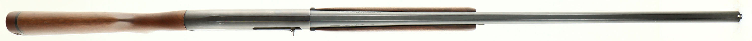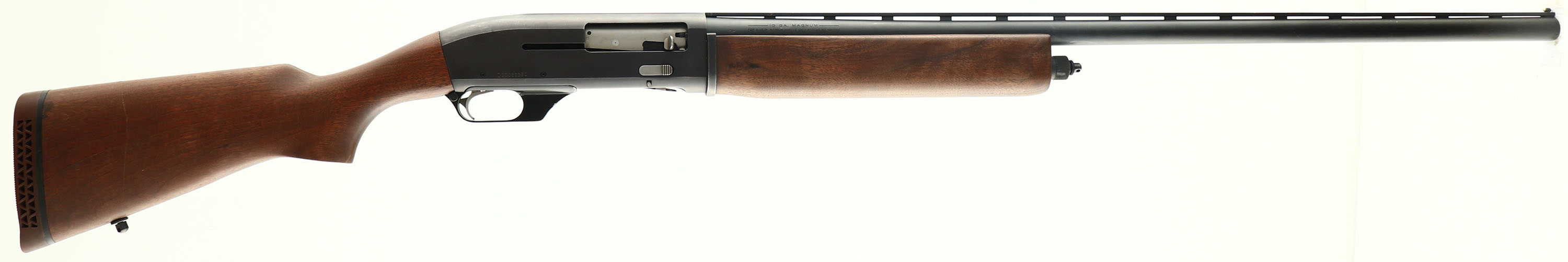 Ithaca, Model MAG-10, CAL: 10GA, MFG: 1974-86, SN: 100029390, Semi Auto Shotgun, 3 1/2'' MAG ONLY, 32'' ventilated rib barrel. The original capped pistol grip wood stocks are very good & solid. They display the original finish but thinning, almost no nicks & dings The original metal blue finish on the barrel rates 80%, the receiver is 50%. Bore is very good. The ventilated rib carries a single ivory front bead. Buttstock carries a factroy vent red recoil pad. Sling swivel studs, LOP: 14 3/8'', Weight: 11.9 lbs. A great goose or turkey gun. FFL Req. - Value: 400 to 800