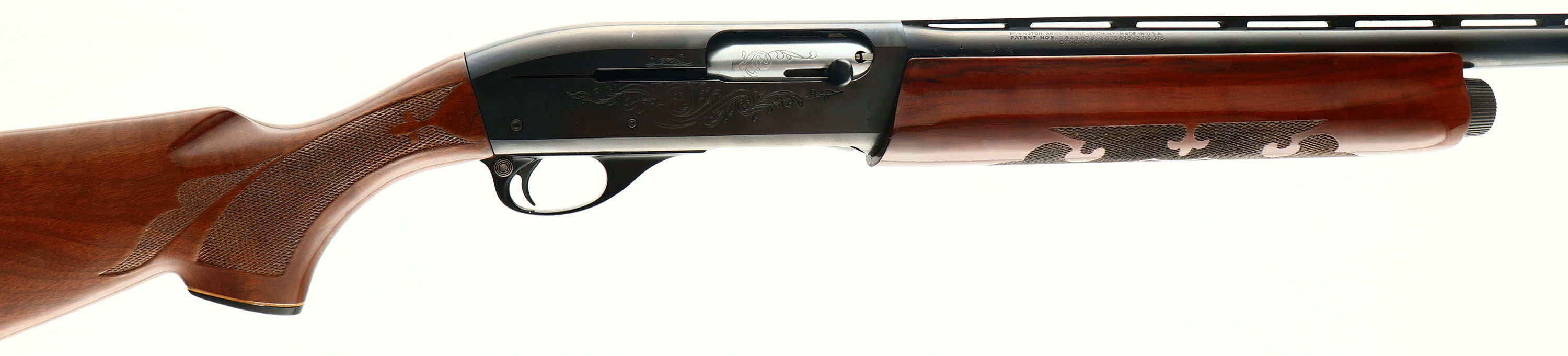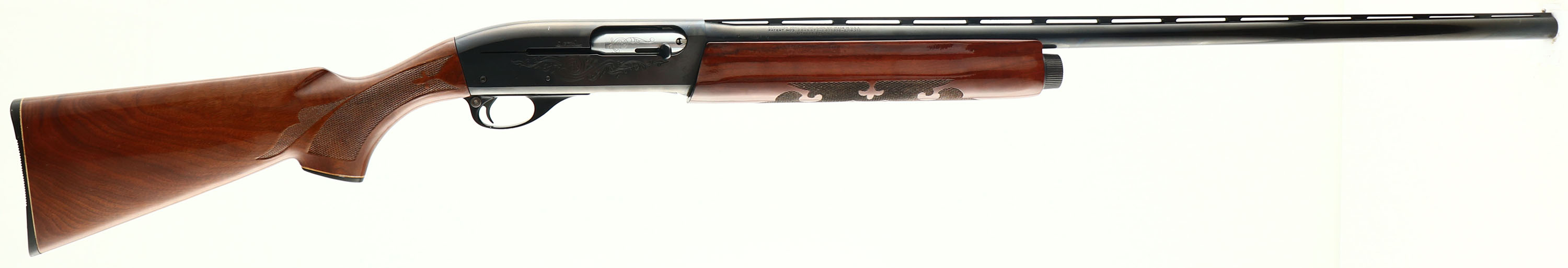 Remington Model 1100, CAL: 12GA, MFG: 1970, SN: L244618V, Semi-Auto Shotgun, Choke: Full, 30'' ventilated rib barrel. The receiver & bolt display an ornamental roll stamp engraving. The factory checkered & capped pistol grip wood stocks are excellent, displaying the original high gloss finish with very light handling marks. The metal blue finish rates 95% overall. Bore is excellent. The ventilated rib holds a single front bead. Buttstock carries a Remington black plastic buttplate. LOP: 14 1/8''. FFL or C&R Req. - Value: 400 to 800