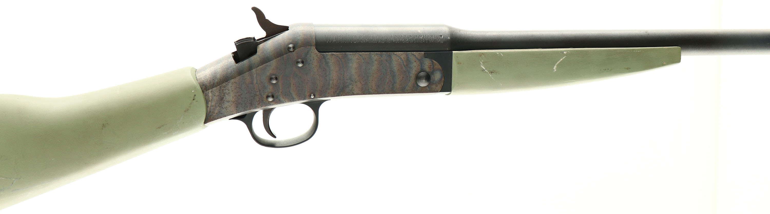 New England Firearms Co, Model Pardner, CAL: 20 GA, MFG: Modern, SN: NU320323, Break Action Single Shot Shotgun, Chamber: 3, Choke: MOD, 22'' barrel. The flat pistol grip wood stock & forend are very good, carrying a light flat green paint finish. The are several minor to small rubs & scrapes. The metal blue finish rates 95% overall, The receiver displays attractive case-colors. Bore is excellent. The barrel holds a single front bead. Buttstock carries a ventilated recoil pad. FFL Req. - Value: 150 to 250