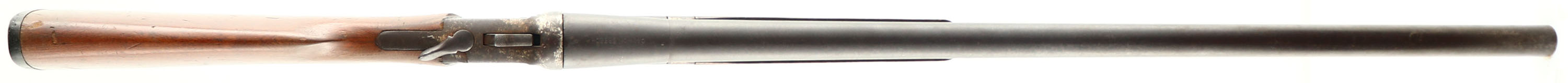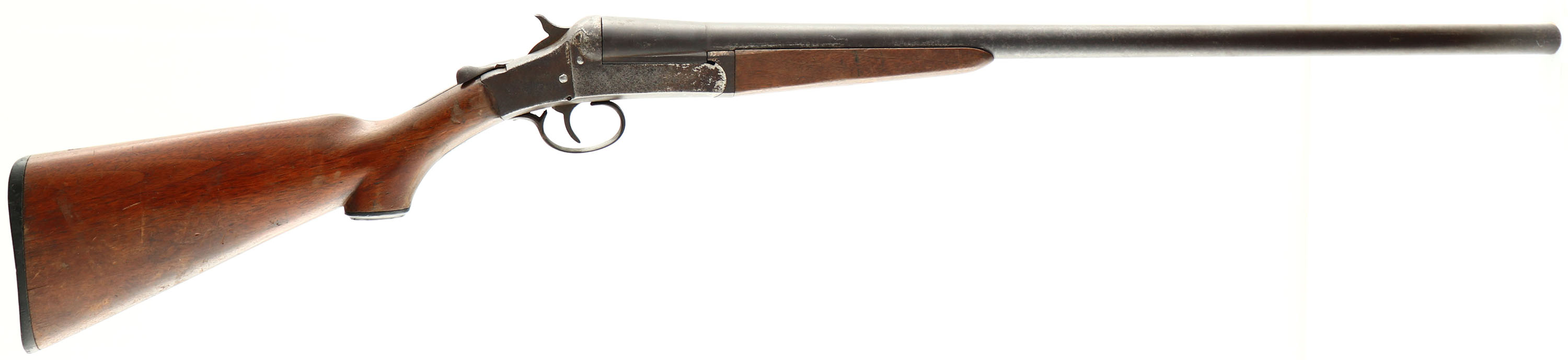 Simmons Hardware Co. (Hopkins & Allen), Model Cannon Breech Single Break Shotgun, CAL: 12 GA, MFG: 1910, SN: N1468, MOD, 27 3/4'' barrel. The original capped pistol grip wood stocks are good & solid, despite a 3'' stress crack on the left side of the wrist. There are numerous contusions, scrapes, nicks & scratches to the thin & worn original finish. The metal finish has worn & toned to a brown patina. The nickeled receiver has also worn to a brown patina, with some remnants of nickel. Bore is good, but with some spots of cleaned roughness. No bead on barrel. Buttstock carries a Simmons black plastic buttplate. FFL or C&R Req. - Value: 80 to 150