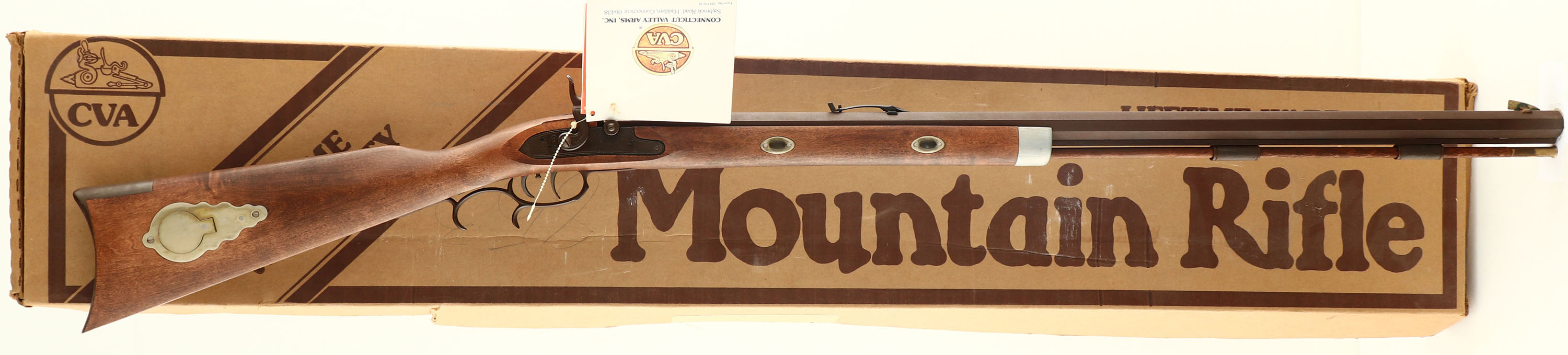 BOXED, CVA, Mountain Rifle, CAL: 50, MFG: N/A, SN: 0080995, Single Action Percussion Rifle, 32'' octagon barrel. Factory markings on barrel. The cheeked straight grip wood stock is excellent. The browned finish is excellent. Bore is excellent. Adjustable rear sight & blade front sight. Crescent metal buttplate. Comes in factory box, with original hang tags still attached. Blackpowder, No FFL Req. - Value: 150 to 250