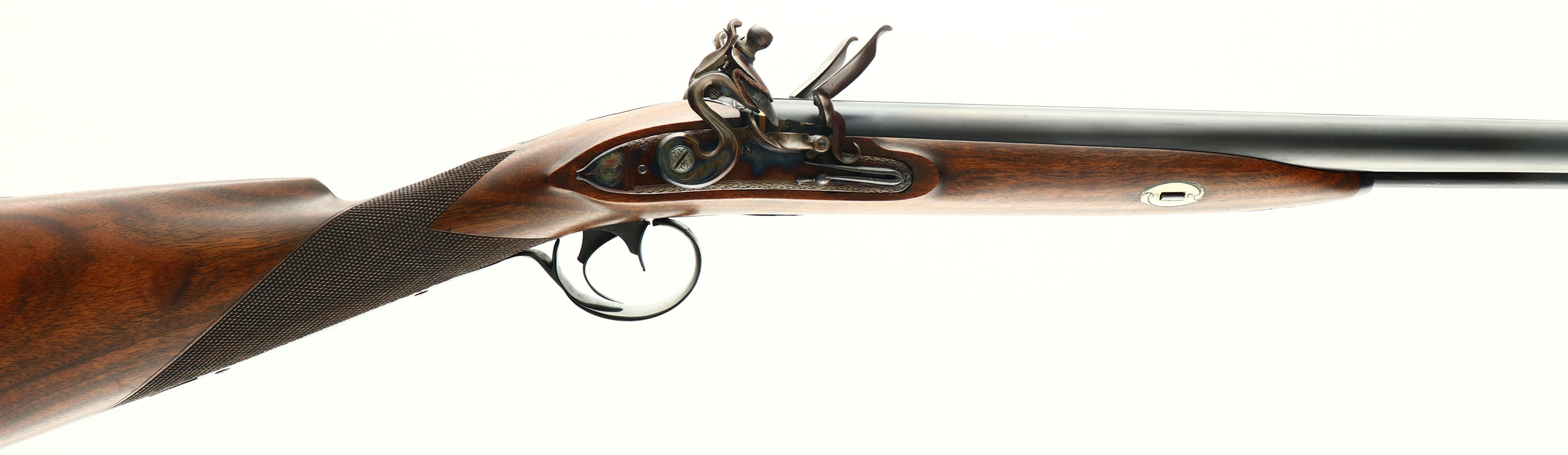 Stan Cherubin, Double Flintlock Shotgun, CAL: 12 BORE, MFG: 2008, SN: 28, Flintlock Muzzleloader SxS, 30 1/2'' barrels. This gun was custom built in 2008 by Stan Cherubin. Cherubin has been a gunmaker since 1974. Included with this gun is a breif history of Cherubin & how he came to be a gunmaker. This shotgun is compiled of modern parts & finishes to best replicate & recreate the look & style of the originals. The beautiful English Walnut checkered straight grip stock is excellent. The original finish is excellent. The metal finishing was done by Doug @ Turnbull Company. The blued finish on the Mossberg barrels is excellent. There is a single gold inlaid strip 1/4'' from the stock. Under the barrels is engraved ''C.LINDSEY M'TOWN CYL/CYL 9531''. The Durs Egg flintlock systems are case-hardened, retaining vivid case-colors. Durs Egg was a master English gunmarker. These are copies of an original flintlocks featuring a waterproof pan, pierced bridle, fly in the tumbler, stirrup typer mainspring & a roller mounted frizzen on an internally polished plate. They measure 5'' x 15/16'' with the recommended flint size being 3/4''. The solid rib holds a single brass bead. Stock has a smooth blued metal buttplate. Double triggers. Ramrod present. A gorgeous hand crafted shotgun. - Value: 3000 to 5000