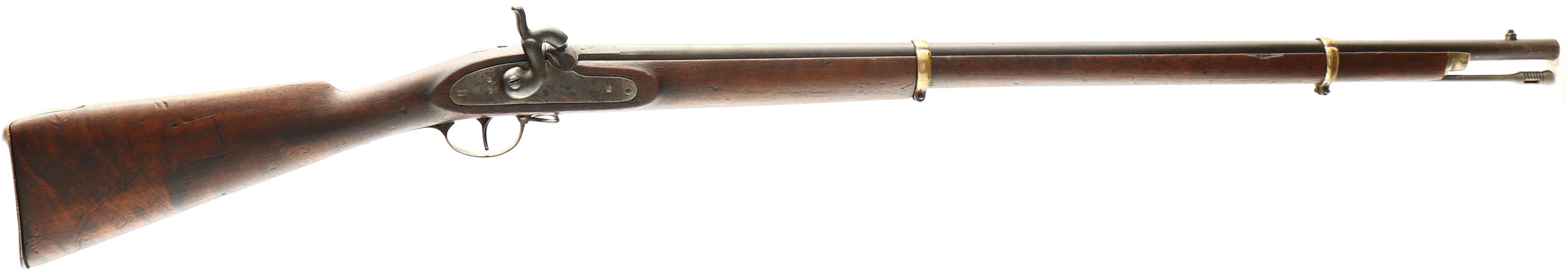 Lambin & Theate, Copy of ''The Little Enfield'', CAL: 47, MFG: 1886-94, SN: NONE, Percussion Muzzleloader, 27 7/'' barrel. Originally, ''The Little Enfield'' muskets were made for Cadets in Brazil. Some examples made it north to America, where they were sold as ''American Civil War'' guns. Although that is inaccurate, it helped attract potential buyers. This example is made by Lambin & Theate (Belgium) from appx 1886-1894. The company was well-known for making copies of ''old'' style arms for export to Africa & South America, where cartridges may have been harder to come by. The barrel is marked ''L&T'' in a rectangle, with proofs on the left/right barrel flats. The side plate is also stamped ''L&T'' in a rectangle. The initials ''W.S.C'' are carved into the left stock flat & left side of buttstock. There may be a couple other non-legible letters throughout the stock. The wood stock is good & solid. There are numerous small contusions, dings, scotches & scrapes. The blued finish on the barrel has toned to a mix of remaining blue & brown patina. The case-hardened side plate retains visible case-colors. Brass hardware has an aged/orange patina. the rear lock plate/side plate screw is missing. Bore is poor, dark & rough. Blade front sight. Brass buttplate. the percussion nipple tip where the cap sit, has broken off, the base of the nipple still in rifle. Scaled down bayonet. This is a functional firearm. Black powder, No FFL Req. - Value: 600 to 1200