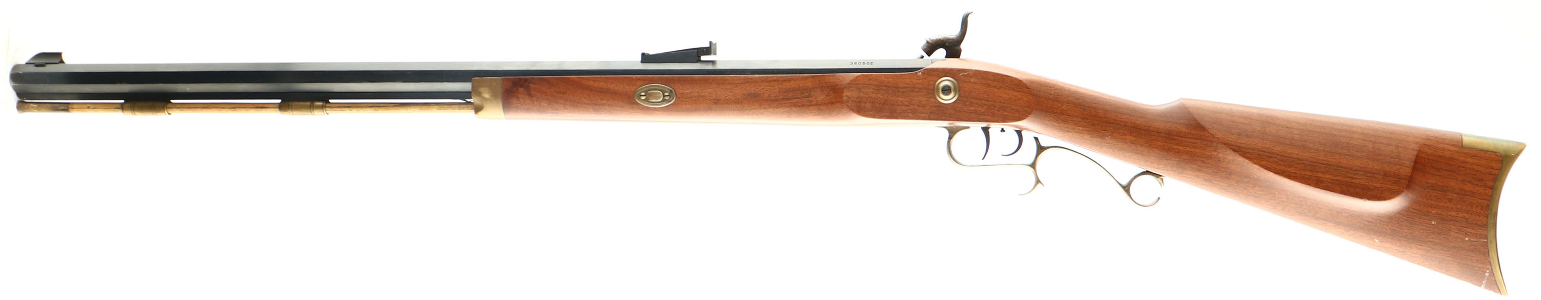 Thompson Center Arms, Hawken Rifle, CAL: 50, MFG: N/A, SN: 390502, Percussion Muzzeloader, 28'' barrel. Factory marking on barrel. Marked ''HAWKEN''. The cheeked straight grip wood stock is excellent. There are some dings & scrapes to the finish. The blued finish on the barrel rates 90%. The case-hardened side plate retains visible, but fading case-colors. Brass hardware has an aged patina. Bore is excellent. Adjustable rear sight & blade front sight. Double set triggers. Crescent metal buttplate. Blackpowder, No FFL Req. - Value: 250 to 450