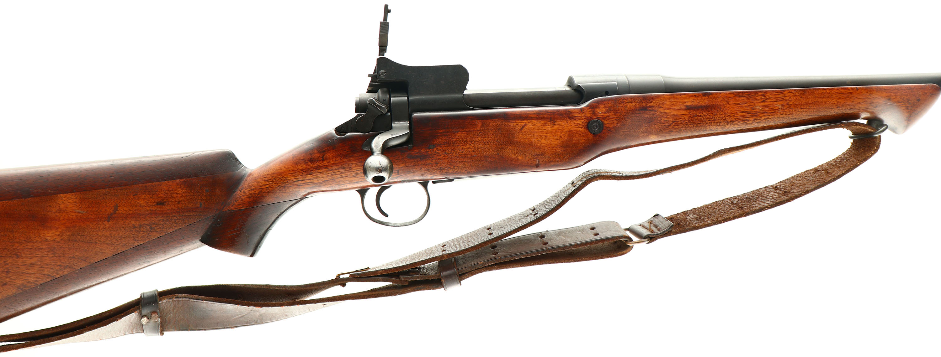 Remington Model: M1917 Enfield, Cal: .30-06, MFG: September 1918, S/N: 423764, Bolt action rifle, 26'' barrel. The aftermarket, semi-pistol grip wood stock is very good with various nicks, dings, dents, & scratches from use/age. The top of the comb & the belly of the stock are separate pieces from the main stock & have been nailed together with the nail holes visible. The metal was refinished when it was refurbished by the military. The metal finish rates 90% overall with spots of light thinning & patina speckling. The top of the receiver is marked ''U.S.'', ''MODEL OF 1917'', ''REMINGTON'', & the S/N. the left receiver flat is marked with the US flaming bomb, & two faded eagle head proofs. The end of the barrel is marked with a faded ''J.A.'' over a flaming bomb. The barrel also has a few other small proof marks. This rifle is a mix of Remington & Eddystone parts, typical of a rebuild rifle. The bolt has been converted to be cock on open, rather than to be cocked on close. The bore is very good. Its bright with light roughness throughout. The rifle has it original sights, a blade front sight with protective ears & a receiver mounted, elevation adjustable aperture rear sight. Rear sight ladder is marked 2 to 16. The stock carried a rubber recoil pad marked ''KICK EEZ''. The stock has both sling swivels & comes with a leather M1907 style sling. This was a Military refurbished M1917 Enfield, Evident by the mix MFG parts & also having A WW2 production Johnson Automatics Replacement barrel. A excellent hunting rifle or a nice project to ''un-Sporterized'', since the barrel has not been cut. FFL or C&R Req. - Value: 150 to 300
