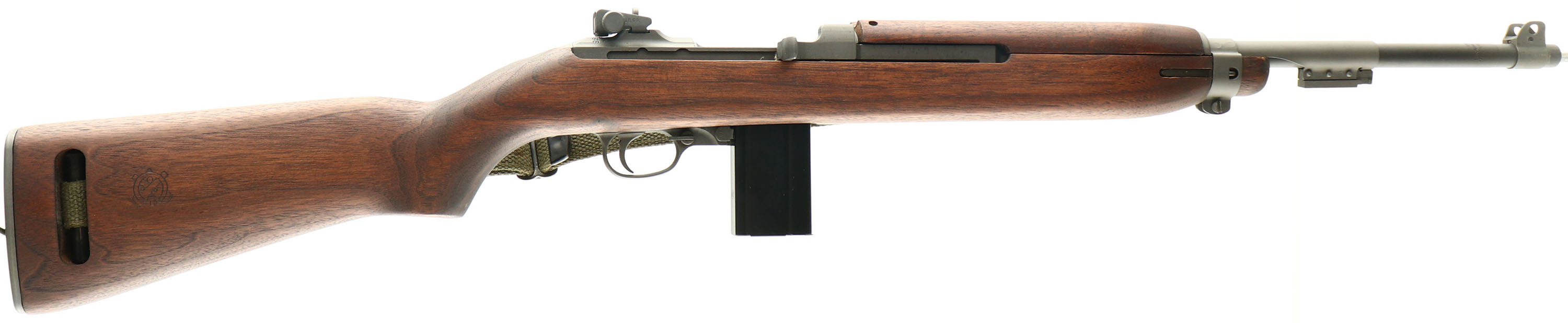 CONDITION: the semi-pistol grip walnut stock is excellent. Type 3 stock. The right cheek has a crisp crossed cannon US acceptance cartouche. The sling well is stamped with the MFG mark ''IO'' for the S.E. Overton company of South Haven Michigan. Their prime contractor was Inland. The parkerized metal finish rates 98% with minor wear. The front receiver band is marked ''U.S. CARBINE'', ''CAL .30 M1''. The rear of the receiver is marked ''INLAND DIV'' & the S/N. The top end of the barrel is marked ''INLAND MFG DIV.'', ''GENERAL MOTORS'', ''5-43''. The barrel band is marked ''M M Q''. The rear sight is marked ''J.R. Co.'', mag release marked ''M'' & ''WA'', & the front sight is marked ''U''. This rifle has the 3rd style barrel band with bayo-lug, updated 15 & 30 Rd mag release, updated rotary safety, & updated adjustable rear sight. The bore is excellent. Its bright & mirrorlike with a couple spots of light roughness. The stock carries a checkered, parkerized steel buttplate, has a spot of patina. The rifle has the front, left side mounted sling loop, & a sling well for use of a oiler bottle for the rear sling mount. has oiler bottle & period correct green canvas sling. comes with one 15 rd. mag. FFL or C&R Req - Value: 800 to 1600