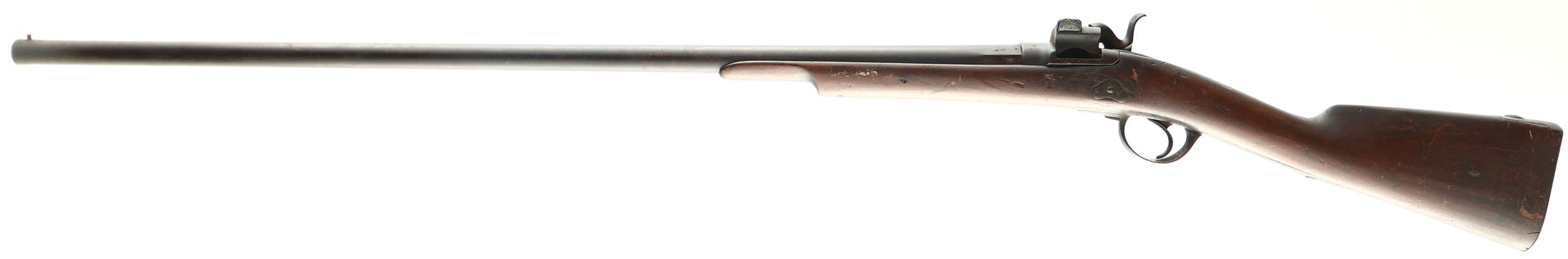 HISTORY: This started life as a French made Muzzleloader, either a MLE 1842 or a MLE 1853/57. It was then upgraded with the Tabariere breech loading system. invented in 1864, roughly 358,000 rifles had been converted by July of 1870, in time for the Franco-Prussian war where they were used by second line troops or in defensive roles since this weapon system was inferior to the Chassepot rifle. After the war they were sold to Belgium who converted them into very cheap shotguns, known today as ZULU guns. This was done in the late 1870s to the 1880s. large numbers of these would be bought by US importing companies & sold on the US hunting market as a cheaper alternative than the US made shotguns. Sometimes there were marked with trade names of ''ZULU'', or ''HUNTER''. These shotguns would cost 3-5 bucks where a US made pump action shotguns costed 15-20 bucks. This gun comes with a photocopy of a old Saxon ad from Harpers Weekley in 1881, that shows these guns being sold for $5.50