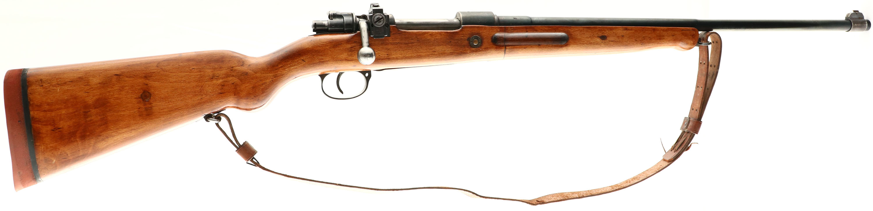 Amberg Arsenal, Model: Gewehr 98, Cal: 7.92x57mm (8mm Mauser), MFG: 1916, S/N: 6539 (serial block n), Bolt action rifle, 22'' barrel. The semi-pistol grip wood stock is very good as being cut down, shaped, sanded & re-finished. There is a duffle cut repair just in front of the magazine, repair is solid. There is a resin plug fill on the buttstock & on the bottom of the forend. there are the faint remains of the outlines of a couple cartouches on the belly of the stock & bottom of the wrist. The metal has been re-blued & rates 80% with spots of thinning & light patina. The left side of the receiver is marked ''GEW.98'' in German script. The left side of the receiver band is marked with the S/N & a lion proof. The top of the receiver band is marked with a crown over ''AMBERG'', ''1916''. The barrel is marked with a few small proofs & misc. part/assembly numbers. S/N mismatched bolt, trigger guard & magazine floorplate. All bolt components S/N match. Bolt appears to be from a K98k with Waffenamt proof marks & having a bent bolt handle. The bore is good. its bright with roughness. The barrel holds a aftermarket beaded blade front sight marked ''PACIFIC''. Rear sight is a receiver mounted Aperture rear sight marked ''REDFIELD''. Both sight bases have light speckled surface rust. The stock carried a ''AIROGEL'' rubber recoil pad. The rear sling mount is original with a added front swivel to the forend. Rifle comes with leather sling. FFL or C&R Req. - Value: 200 to 400