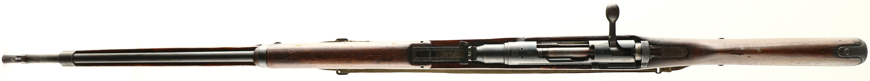 Tokyo Artillery Arsenal, Model: Type 38, Cal: 6.5x50mmSR, MFG: 1906-23, S/N: 986144, Bolt action rifle, 31 1/4'' barrel. The semi-pistol grip Japanese Walnut stock is good. Has various nicks, dings, gouges, vice marks, & scratches from use/age. Japanese style two-piece buttstock. Right side of stock has spots of white paint. Glue has been added to the left side of the joint between the two-piece buttstock. The upper handguard has a couple small cracks & grain pops. The blued metal finish on the receiver rates 75% with spots of thinning & brown patina. The blued metal finish on the barrel rates 80% with wear/thinning at the muzzle & spots of brown patina. Left side of the receiver is marked with the S/N, Tokyo Arsenal logo, & two small inspector stamps. The top of the receiver band is marked with a fully intact chrysanthemum, & ''TYPE 38'' in Japanese. The rear receiver bridge is marked with a small triangle in circle stamp & a small circle stamp. The left side of the barrel is marked with a small triangle in circle stamp, & ''S''. S/N mismatched bolt & marked parts. The bore is very good. Has strong rifling with roughness. The barrel holds a barleycorn front sight with a flip up ladder, V-notch rear sight marked 5 to 24. The stock carries a blued steel buttplate with worn finish around the edges. Rifle has a cleaning rod & both bottom sling loops. Rifle comes US Vietnam era green canvas carry strap that was converted into a sling. a nice example of a non ground Mum Arisaka. FFL or C&R Req. - Value: 250 to 500