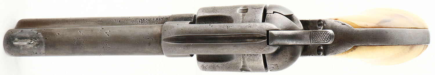 UNIQUE SET, Colt 1873 Single Action Army, CAL: 44, MFG: 1883, SN: 88482?, Single Action Revolver, 4 3/4'' barrel. The top barrel address has worn smooth & is not visible. The left side of the barrel is faintly marked ''44 COLT''. The left side of the frame is marked with the standard three line patent dates. The Rampant Colt logo is not visible. The left side of the trigger guard is faintly marked ''44 CAL''. Partially legible, all matching SN on the frame, trigger guard & butt. The cylinder is marked ''4706''. The polished bone grips are exellent. There are a few minor cracks around the edges. The original metal finishes have fully worn to gun metal gray. There are remnants of applied finish, thin brown patina & intermittent pitting throughout. Bore is poor, dark & rough, with consistent pitting. V-notch integral rear sight & blade front sight. This revolver is accompanied by a early 1900's Connolly Bro's tooled ammo belt & matching double looped holster. Connolly opened it's first shop in Klamath Falls, OR in the late 1800's, closed the doors in 1900, then re-opened a couple shops in Butte & Billings, MT before permanently closing the doors in 1927. This set is from the Billings location. The belt carries a black Jack Sap, a pair of unmarked handcuffs (with functional key) & an unmarked knife sheath that holds an unmarked blade with bone handle. The belt is decorated with a badge marked ''WABASH RY.CO 831 POLICE''. Another neat custom Old West set. Antique, No FFL Req. - Value: 2000 to 4000
