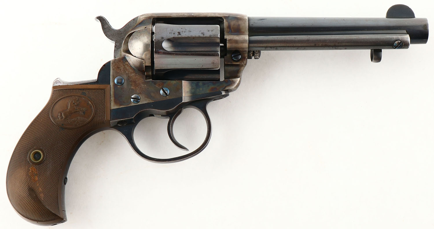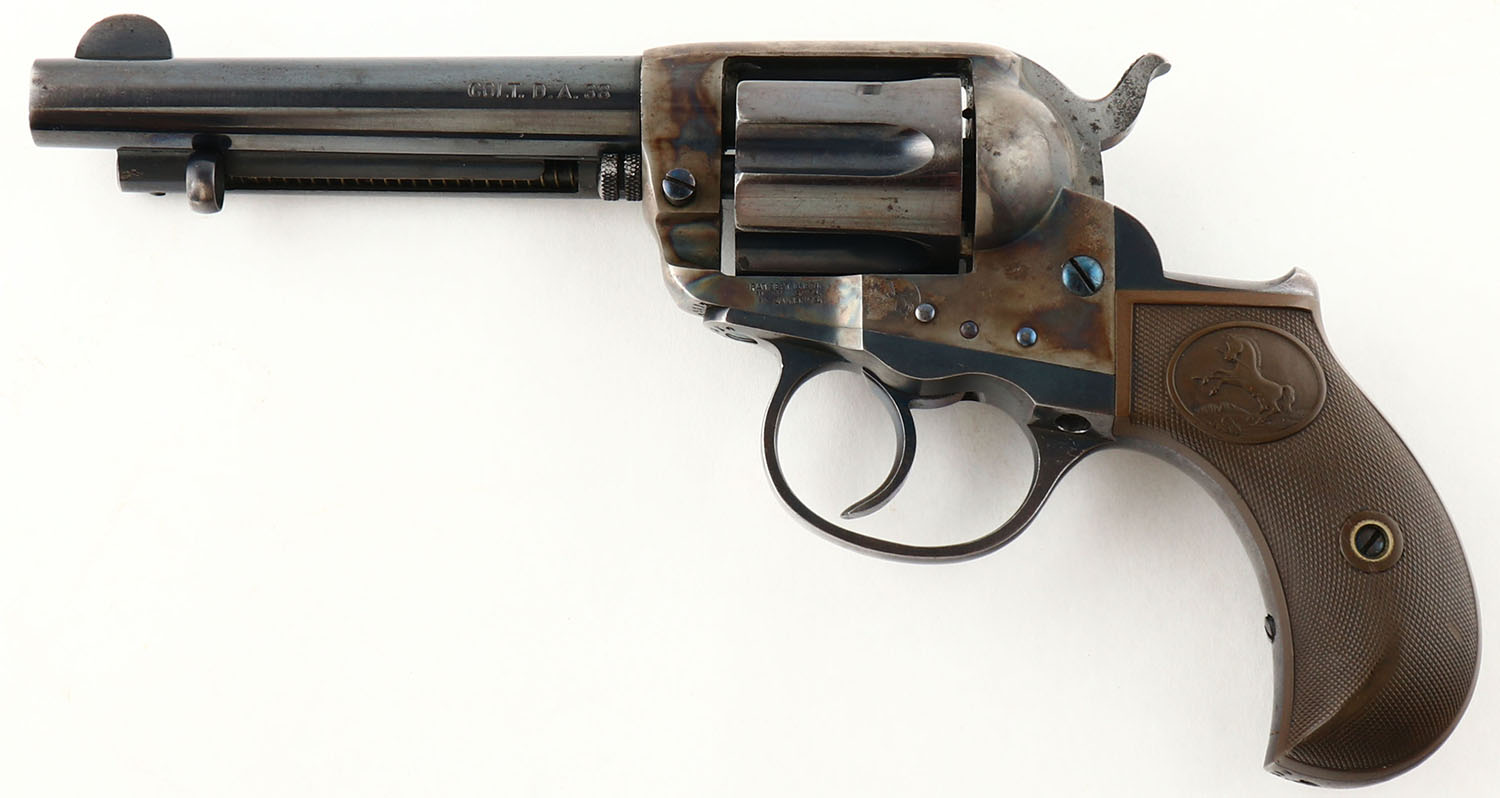 Colt, 1877 ''Lightning'', CAL: 38, MFG: 1901, SN: 123217, Double Action Revolver, 4 1/2'' round barrel. The top of the barrel is stamped in two lines ''COLTS PT.F.A MFG. CO HARTFORD, CT. U.S.A''. The left side of the frame is marked with the standard three line patent dates, next to the circled Rampant Colt logo. The full SN can be found on the frame, trigger guard & butt. The original checkered brown hard rubber grips with Rampant Colt are excellent. There is a small spot on both grips where the checkering is worn smooth & some minor contusions, otherwise excellent. The original metal blue finish on the barrel rates 90%, with concentrated holster wear to the muzzle & ejecotor rod housing. The cylinder rates 85% & the trigger guard rates 50-60%, with concentrated loss to the straps, with areas beginning to tone to a brown patina. The case-hardned frame is excellent, retaining vivid case-colors. Bore is very good, with intermittent roughness & a couple spots of pitting, concentrated to the top of the bore. Small v-notch rear sight & large blade front sight. An excellent example of an all original 1877. FFL or C&R Req. - Value: 1400 to 2000