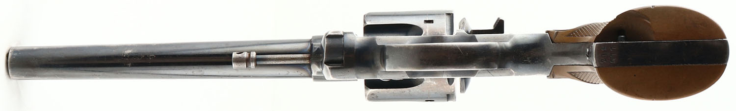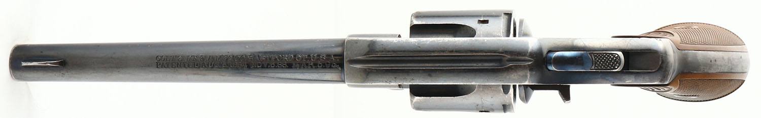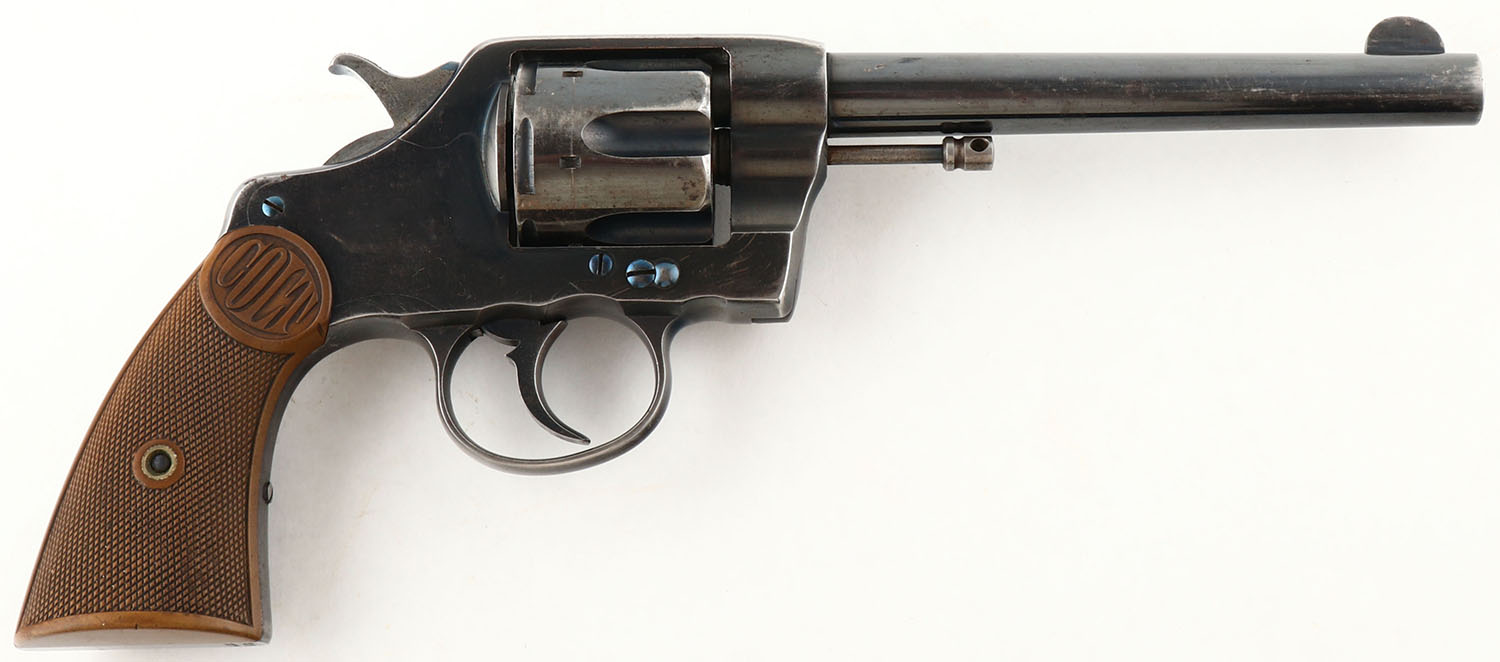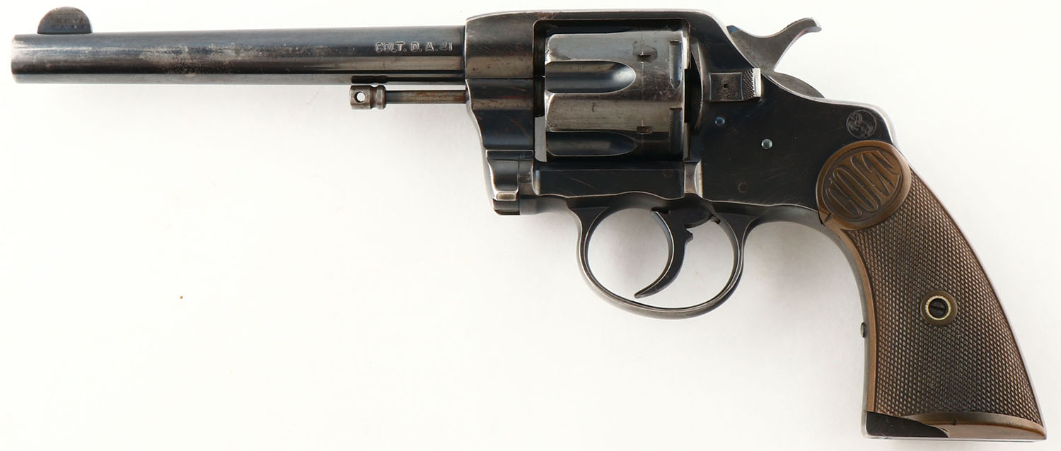 Colt, Model 1896/D.A 41, CAL: 41, MFG: 1903, SN: 218077, Double Action Revolver, 6'' barrel. The top of the barrel is stamped in two lines ''COLTS PT.F.A MFG. CO HARTFORD, CT. U.S.A/ PATENTED AUG.5.1884 NOV.6.88 MAR.5.95''. The left side of the barrel is marked ''COLT D.A 41''. The circled Rampant Colt logo can be seen on the back of the frame above the left grip. The SN is stamped on the butt. Part #''220'' can be seen on the frame, cylinder & cylinder release lever. The original ''COLT'' checkered rubber grips are good. The bottom front corrner of the left grip is missing, alongside other minor scrapes & dings. The original metal blue finish on the barrel rates 75% & the frame rates 65%, with areas worn to metal gray & toned to a brown patina. Bore is very good, bright, with intermittent roughness & spotting throughout. Groove rear sight & blade front sight. FFL or C&R Req. - Value: 600 to 900