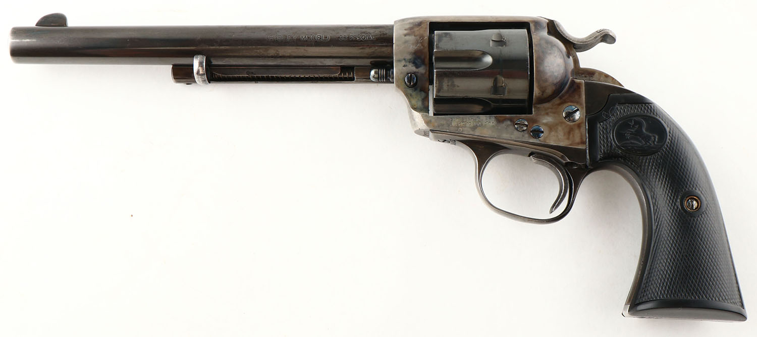 Colt Bisley, CAL: 38 WCF, MFG: 1904, SN: 258881, Single Action Revolver, 7 1/2'' barrel. The pistol carries an ampersand ''&'' mark used by Colt to indicate a revolver having been returned to the factory for adjustment, repair or refinishing. The checkered & Rampant Colt hard rubber grips are very good, with a couple of minor nicks or contusions, & smoothing of checkering from use. The metal blue finish rates 70% overall toning grayish/brown as it thins & ages. The cylinder bright blue rate 85%. The case-hardened frame displays strong case colors. Bore is excellent, bright with proud rifling. Matching SN on the frame, trigger guard & bottom strap. The top of the barrel is stamped ''COLTS PT.F.A MFG. CO HARTFORD, CT. U.S.A''. The left side of the barrel is marked ''(Bisley Model) 38 Special''. Left side of frame is stamped with the two line patent dates. Action & cylinder timing function properly. FFL or C&R Req. - Value: 1200 to 2500
