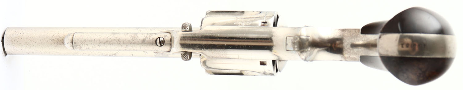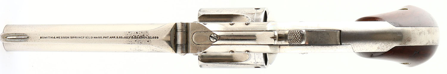 Smith & Wesson, Model Number 1 1/2 ''New Model'', CAL: 32 RF, MFG: 1868-75, SN: 45351, Single Action Revolver, 3 1/2'' barrel. The top of the barrel is marked ''SMITH & WESSON SPRINGFIELD MASS PAT APR 3, 55. JULY 5, 59 & NOV.21.65''. The full SN is stamped on the butt. The original bird's head grips are very good & solid. The left grip has some dings & scarring. The original nickel finish rates 90% overall, with intermittent speckling throughout. Bore is very good & bright, with a couple small areas of spotting/light pitting. Notch rear sight & low profile blade front sight. A very nice example of a Model 1 1/2. Antique, No FFL Req. - Value: 700 to 1200