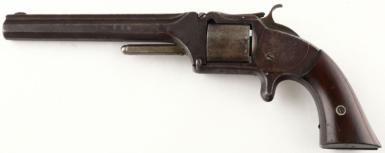 Smith & Wesson, Number Two Old Model, CAL: 32 RF LONG, MFG: 1861-74, SN: 30085, Single Action Revolver, 6'' barrel. The wood grips are very good. There are contusions, scrapes & dings, with protective oils added over time, contributing to darkening. The inside right grip is marked ''44360''. The top of the barrel is marked ''SMITH & WESSON SPRINGFIELD MASS''. The left side of the barrel is stamped ''F&N'' alongside a couple straggling ''F'' stamps. There is one ''F'' on the right side of the barrel. The cylinder is faintly marked ''PATENTED APRIL 3, 1855. JULY 5, 1859 & DEC. 18, 1860''. The metal finish has fully toned to a brown patina, with remnants of blue on the cylinder. Bore is poor, dark & rough. Notch rear sight & blade front sight. This was a popular Civil War sidearm, but was never actually purchased by the Army. Antique, No FFL Req. - Value: 300 to 500