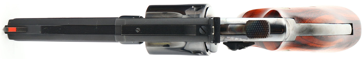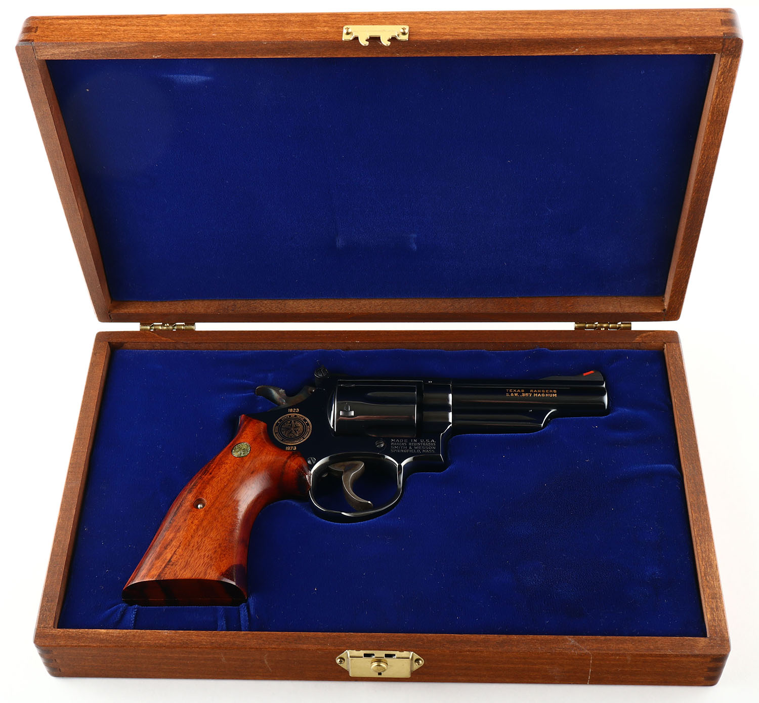 CASED, Smith & Wesson Model 19-3 Texas Ranger Commemorative, CAL; 357 MAG, MFG: 1973, SN: TR9495, Double Action Revolver, 4'' barrel. The right side of the barrel is marked ''SMITH & WESSON'' & the right side of the barrel is marked in two lines ''TEXAS RANGERS/ S&W .357 MAGNUM''. The left side of the frame has the S&W trademark logo. The right side of the frame has the standard four line address stamp & the commemorative seal. The barrel markings & seal are gold washed, with some very minor thinning to the commemorative seal. The plain Texas star medallion wood grips & finish are excellent. The original metal blue finish rates 99% & the case-hardened trigger & hammer display excellent case-colors. Adjustable rear sight & elevated blade front sight with orange insert. Comes in commemorative wood case, with blue interior. Case condition is excellent. Comes with outer protective cardboard box for case. FFL or C&R Req. - Value: 800 to 1200