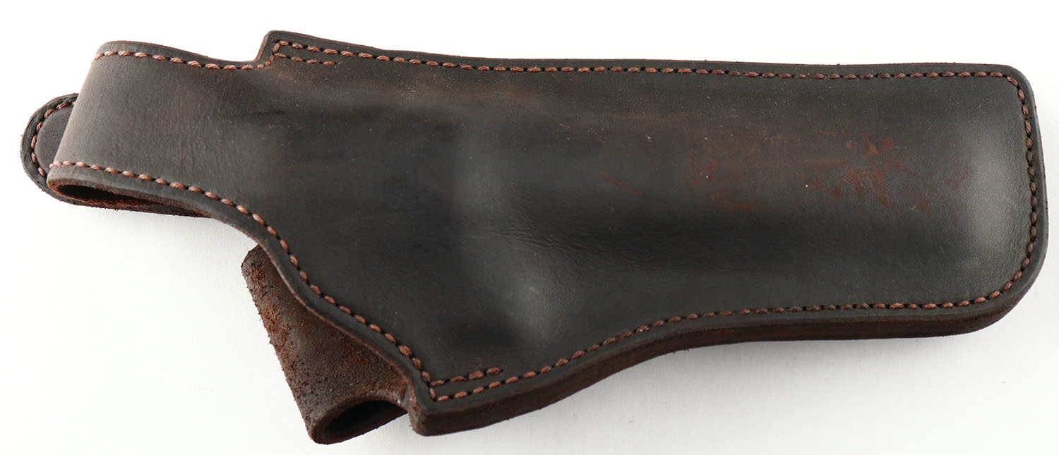 Smith & Wesson, Model 29 Classic (29-5), CAL: 44 MAG, MFG: Modern, SN: TJB3519, Double Action Revolver, 5'' barrel. The leftr side of the barrel is marked ''SMITH & WESSON'' & ''44 MAGNUM''. The right side of the barrel is marked ''29 CLASSIC''. The right side of the frame is marked with the standard four line address stamp & a large S&W trademark logo. The original stipped Hogue rubber grips with S&W medallions are excellent. The original metal blue finish rates 98% overall. Bore is excellent. Adjustable rear sight & elevated serrated blade front sight with orange insert. Comes with an unmarked custom leather holster. FFL Req. - Value: 700 to 1000