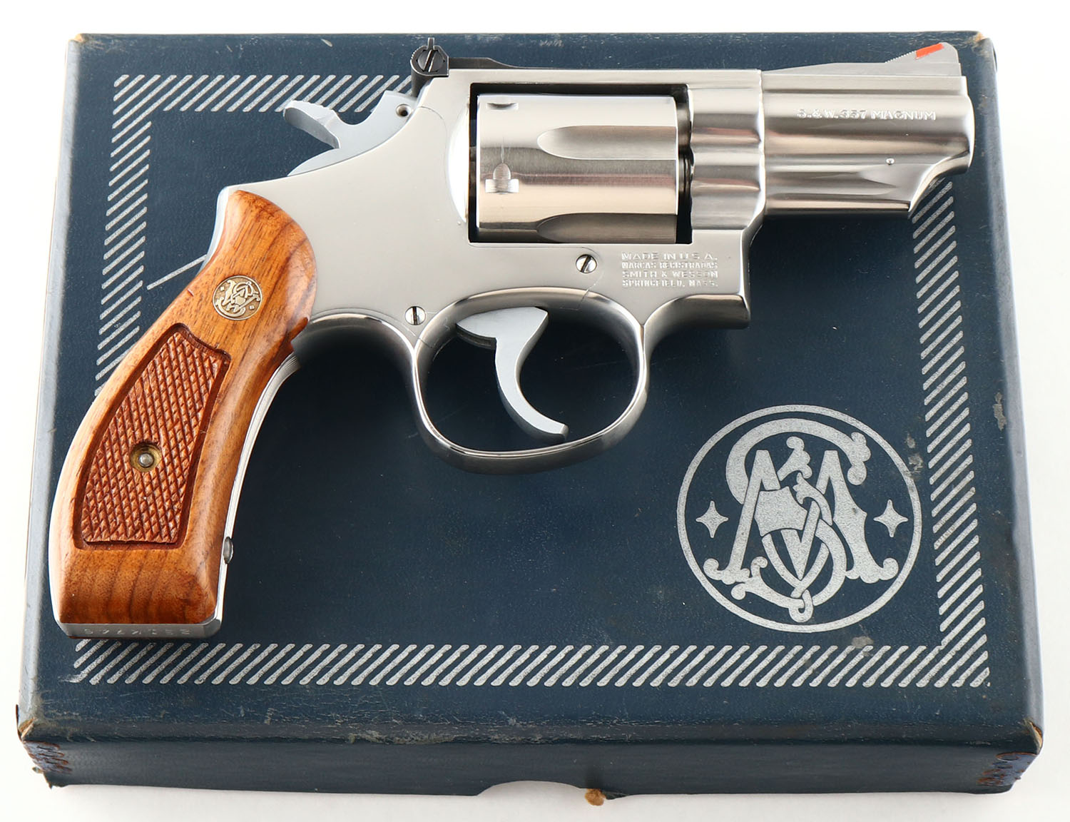 BOXED, Smith & Wesson, Model 66-2, CAL: 357 MAG, MFG: 1982, SN: 251K746, Double Action Revolver, 2 1/2'' barrel. The left side of the barrel is marked ''SMITH & WESSON''. The right side of the barrel is marked ''S&W.357 MAGNUM''. The left side of the frame is marked with the standard four line address stamp. The right side of the frame has a large S&W trademark logo above the grip. The original S&W medallion checkered wood grips are excellent. The original stainless steel finish is excellent. Bore is excellent. Adjustable rear sight & elevated serrated blade front sight with orange insert. Comes in factory SN matching box, with wax paper. FFL Req. - Value: 500 to 800