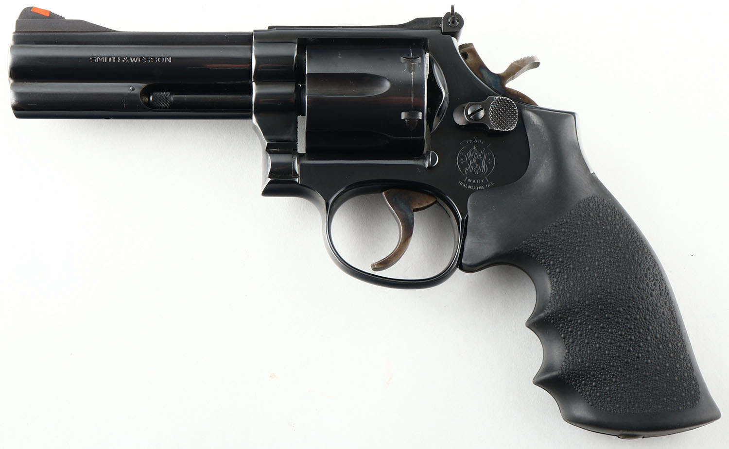 Smith & Wesson, Model 586, CAL: 357 MAG, MFG: 1981-85, SN: AAF1000, Double Action Revolver, 4'' barrel. The Hogue Monogrip stippled rubber grips are excellent. The original metal blue finish rates 97% on the barrel & 98% on the frame. The trigger & hammer retain excellent case-colors. Bore is excellent. Adjustable rear sight & elevated serrated blade front sight. Comes with a unmarked leather holster. FFL Req. - Value: 550 to 950