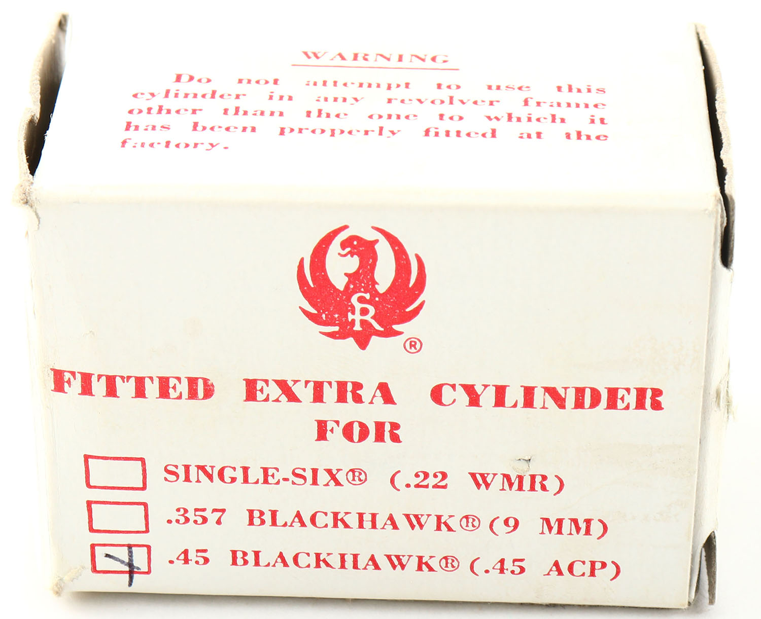 NEW BOXED, Ruger, New Model Blackhawk, CAL: 45LC/45ACP, MFG: 1980, SN: 46-62360, Single Action Revolver, 7 1/2'' barrel. The left side of the barrel is marked with the standard warning & address stamp. The left side of the frame is marked ''RUGER .45 CALIBER/NEW MODEL BLACKHAWK''. The SN is marked on the right side of the frame. The Ruger logo medallion wood grips are mint. The blued metal finish rates 100%. Bore is mint. Adjustable rear sight & elevated serrated blade front sight. Comes in factory box, with .45 ACP cylinder in original box & related paperwork. FFL Req. - Value: 500 to 650