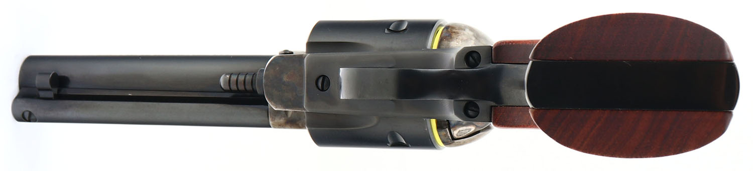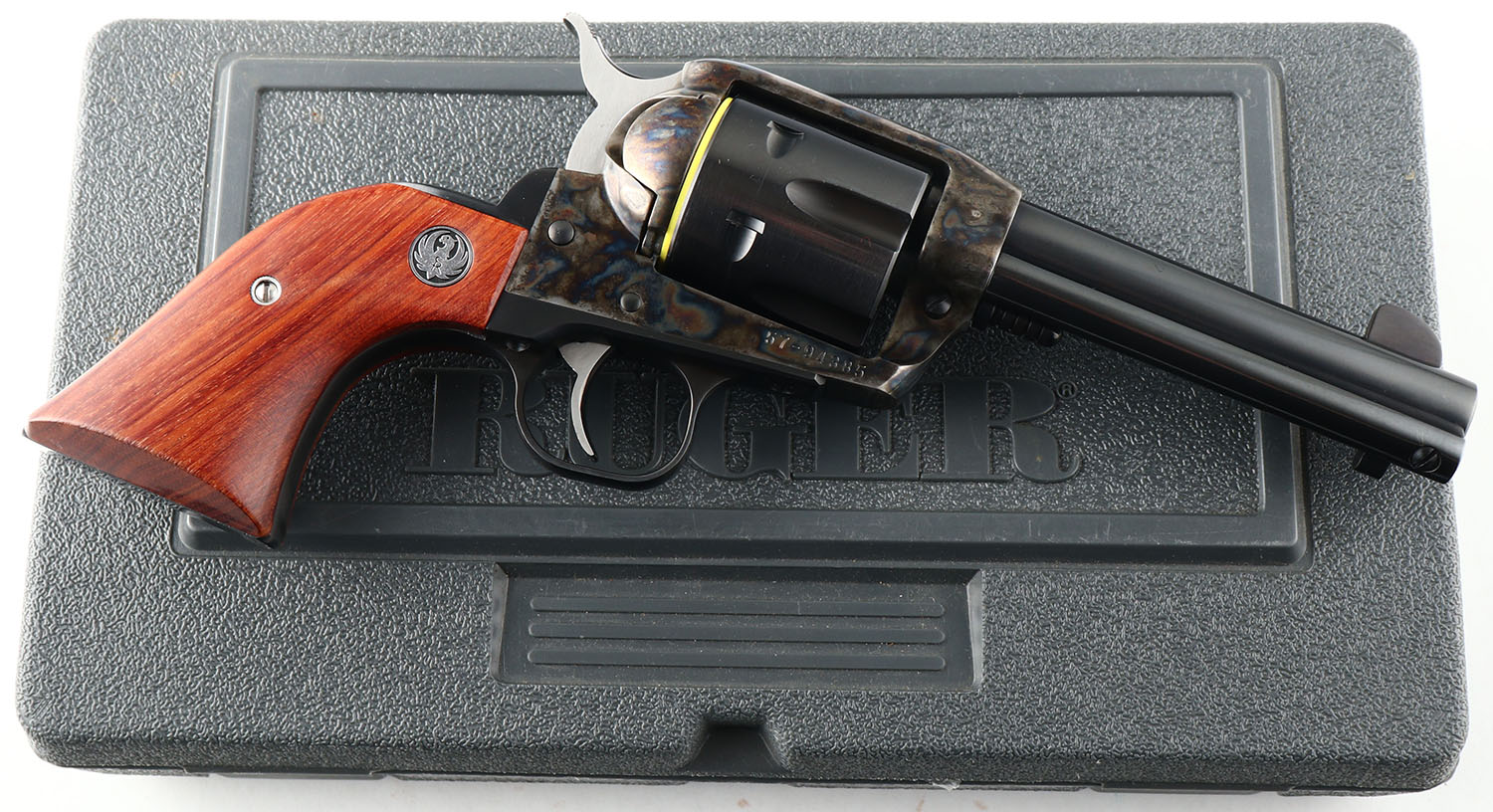 Ruger, Vaquero, CAL: 44 MAG, MFG: 1994, SN: 57-94385, Single Action Revolver, 4 5/8'' barrel. The left side of the barrel is marked with the standard warning & address stamp. The left side of the frame is marked ''RUGER VAQUERO/ .44 MAG CAL''. SN on the right side of the frame. The Ruger logo medallion smooth rosewood grips are excellent. The original blued finish on the barrel, cylinder & grip frame rates 99%. The cylinder has only a faint drag line. The case-colored frame is excellent. Bore is excellent. Square notch rear sight & round blade front sight. FFL Req. - Value: 600 to 800