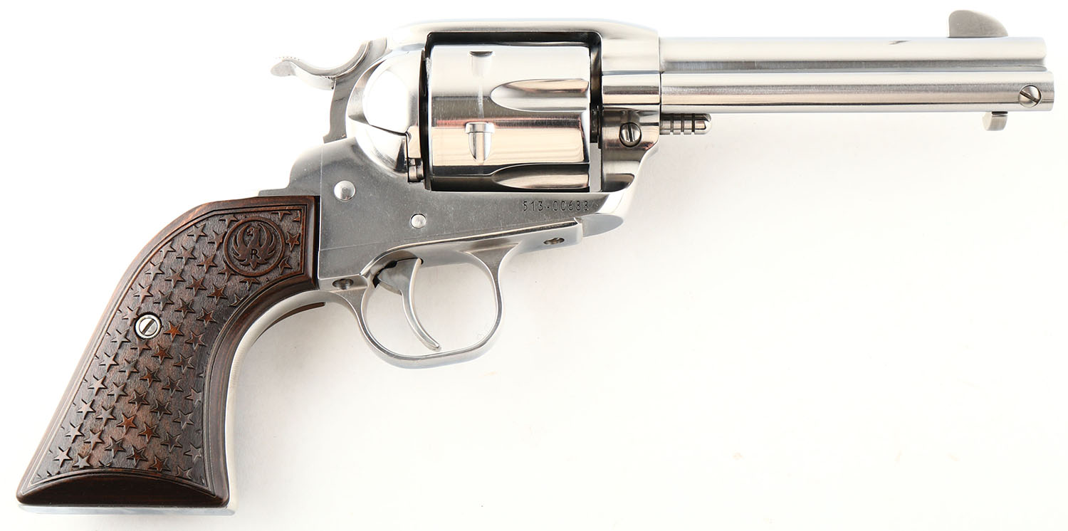 Ruger, New Vaquero - Talo, CAL: 357 MAG, MFG: 2016, SN: 513-00688, Single Action Revolver, 4 5/8'' barrel. The bottom of the barrel is marked with the standard warning & address stamp. The left side of the frame is marked ''RUGER NEW VAQUERO/.357 MAG CAL''. SN on the right side of the frame. The Ruger monogram star engraved wood grips are excellent. The high gloss stainless steel finish is excellent, with fine brush lines from polishing. Bore is excellent. Integral square notch rear sight & dorsal fin blade front sight. FFL Req. - Value: 600 to 850
