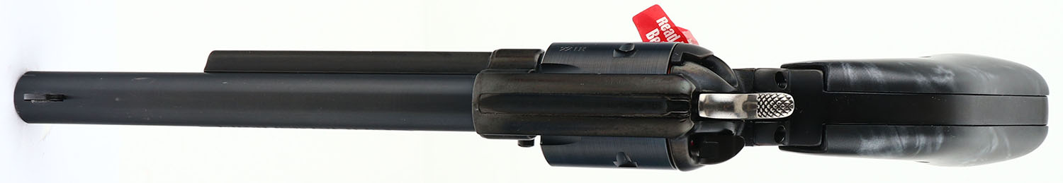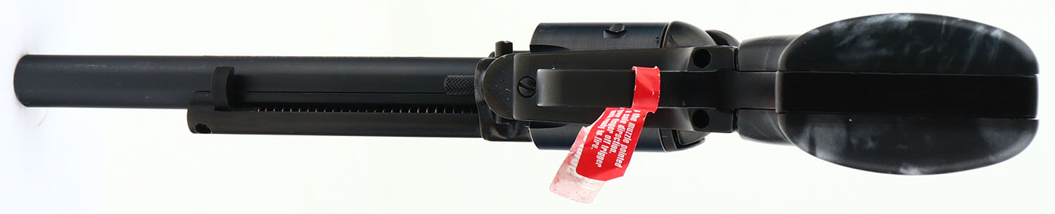 NEW BOXED, Heritage, Rough Rider - Black Pearl , CAL: 22LR, MFG: Modern, SN: 1BH434908, Single Action Revolver, 6 1/2'' barrel. The synthetic black pearl grips are excellent. The metal blue finish on the barrel & cylinder rates 99%. Frame has factory matte black finish, with spotting underneath. These types of finishes are typical amongst most all Heritage products. Bore is excellent. Integral square notch rear sight & blade front sight. Factory hang tag still attached, hammer safety bar & plastic cylinder disc still present. Comes in original box, with related paperwork & lock. NIB. FFL Req. - Value: 120 to 170
