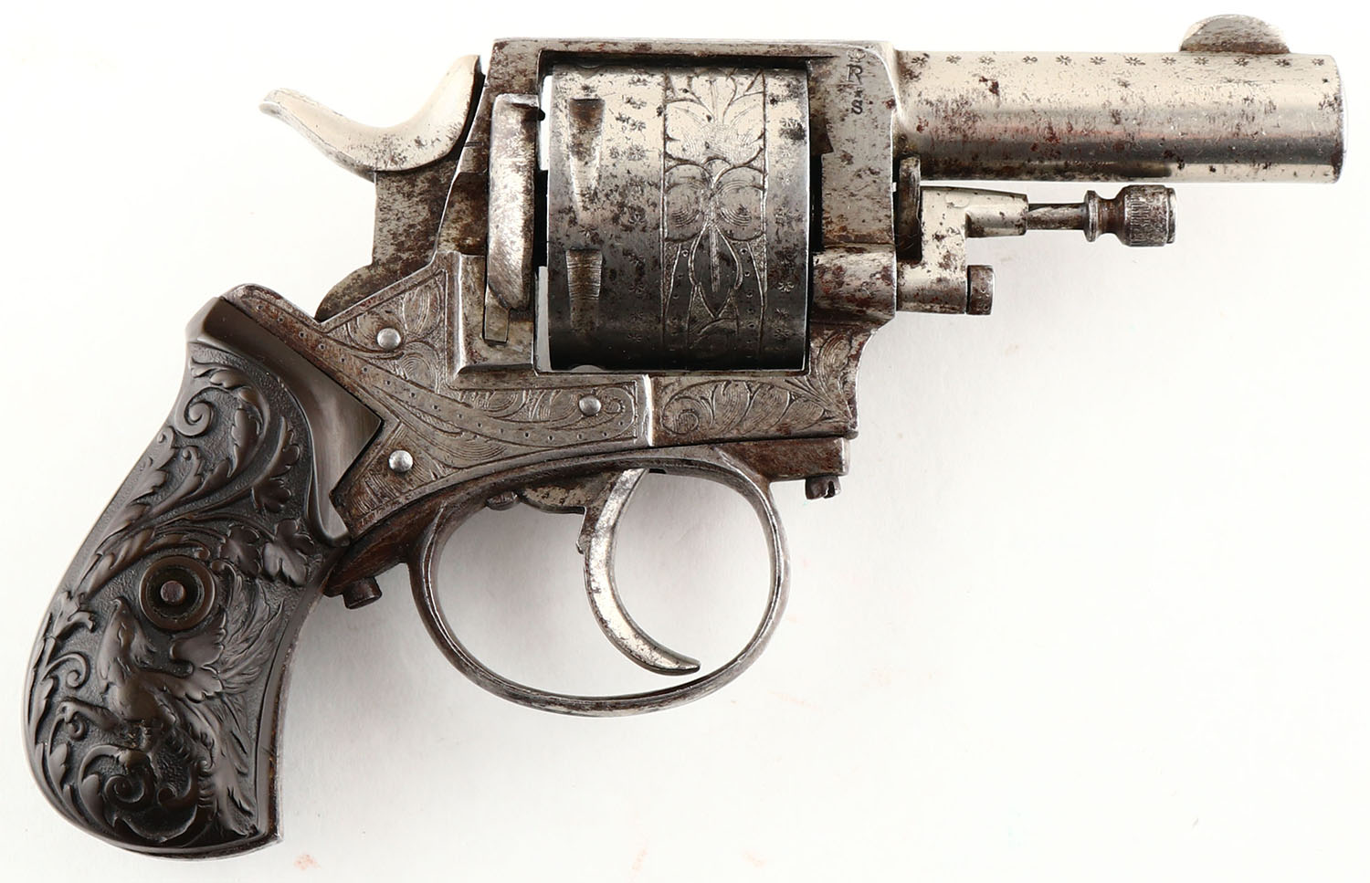 Belgian Bulldog, CAL: 38, MFG: 1890's-1920's, SN: 3335 (under right grip), Double Action Revolver, 2 1/2'' barrel. The right side of the frame is marked with two proofs ''Crown/R'' & ''Star/S''. The cylinder is marked ''Star/S'' & Leige ''ELG in Crown''. The entirety of the revolver is hand engraved with ornamental/floral scroll. The carved hard rubber grips are very good. The left grip has a small edge chip, alongside some other minor dings. The nickel finish rates 85% on the barrel, 75% on the frame & 85% on the cylinder, with consistent spotting toned to a brown patina. Bore is fair, dark & rough. Blade front sight. FFL or C&R Req. - Value: 300 to 600