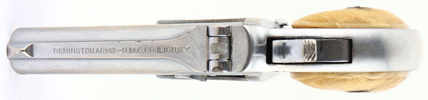 Remington Arms - UMC Co., Model 95 - Double Derringer, CAL: 41 RF, MFG: 1924, SN: L94447, Single Action O/U Pistol, 3'' barrels. The top barrel rib is marked ''REMINGTON ARMS -- UMC CO ILION, N.Y.''. The SN & barrel date code can be seen on the bottom/side of barrel & matching SN is under the left grip. The replacement checkered plastic grips are very good. They fit small to the frame, with noticeable gaps on all sides & there are a couple areas of worn checkering. The restored nickel finish is very good. There is some flaking to edges & visible cleaned pitting under the nickel. Bores are fair, with roughness & pitting amongst thin rifling. Fixed rear sight & blade front sight. FFL or C&R Req. - Value: 250 to 450
