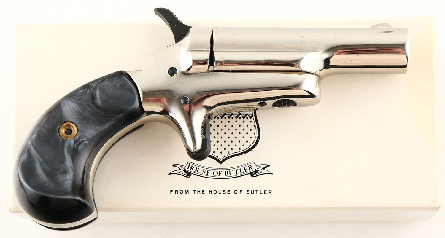 BOXED, Butler, Derringer, CAL: 22 SHORT, MFG: Modern, SN: B36592, Single Action Pistol, 2 3/8'' barrel. The black/silver grips are excellent. The high polish silver finish rates 99% overall. Bore is very good. Blade front sight. Comes in factory box. Internal parts issues, non-functional. Needs to see gunsmith before use. FFL Req. - Value: 100 to 200
