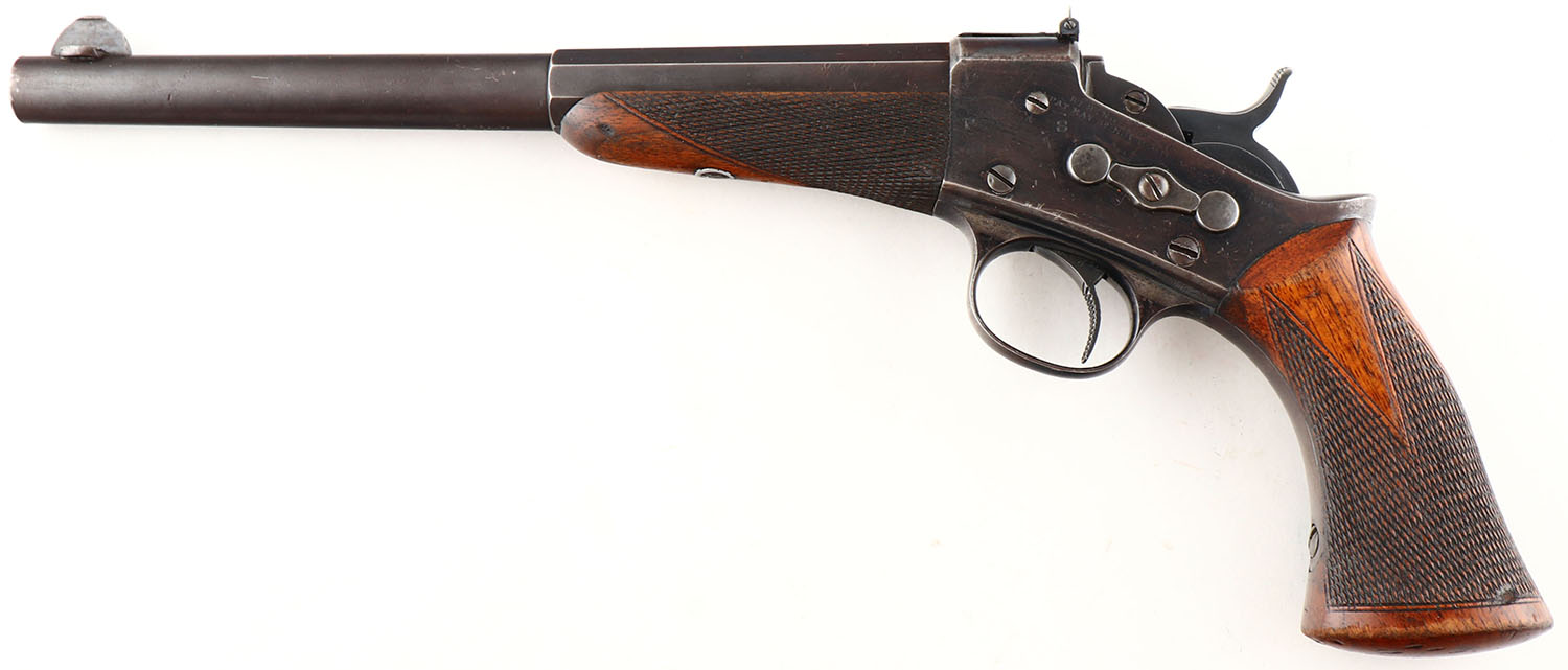 Remington Arms Co., Model 1901 Rolling Block Pistol, CAL: 22 LR, MFG: 1900-1901, SN: 4517 (under grip & barrel), Single Shot Rolling Block Pistol, 10'' half octagon/half round barrel. The top of the barrel is marked ''''REMINGTON ARMS CO. ILION, N.Y.''. The left side of the frame is faintly marked ''''REMINGTON'S ILION N.Y. U.S.A. / PAT. MAY 3D NOV. 15th 1864 APRIL 17th, 1866.'' & ''P S''. The original checkered stocks are very good & solid. There are contusions, dings, scratches & scrapes, with protective oils added over time. The original metal blue finish on the barrel has fully toned to a chocolate patina, with edges worn to metal gray. The original metal blue finish on the frame rates 30%, mostly toned to a brown patina, with blue remaining in protected areas. Bore is very good & bright, with light scarring & thin rifling. Factory rear sight & tall beaded blade front sight. Checkered trigger. Appx 750 produced making these scarce. The ATF classifies these as antiques, as all of these were produced with frames from 1871. Antique, No FFL Req. - Value: 700 to 1000