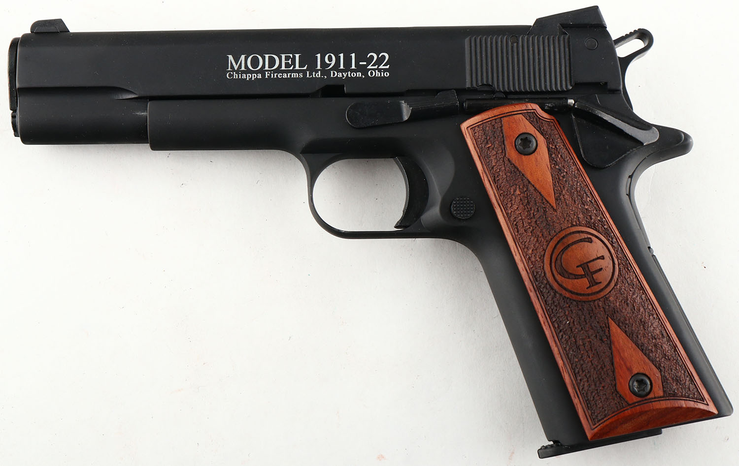 CASED, Chiappa Firearms Ltd., 1911/22, CAL: 22LR, MFG: Modern, SN: 13F81444, Semi Auto Pistol, 5'' barrel. Standard factory markings on the slide & frame from both manufacturer & importer. The CF monogram textured wood grips are excellent. The matte black finish rates 99% overall. Bore is excellent. Square notch rear sight & blade front sight. Comes in factory hard case, with extra mag, cleaning brush & related paperwork. FFL Req. - Value: 150 to 300