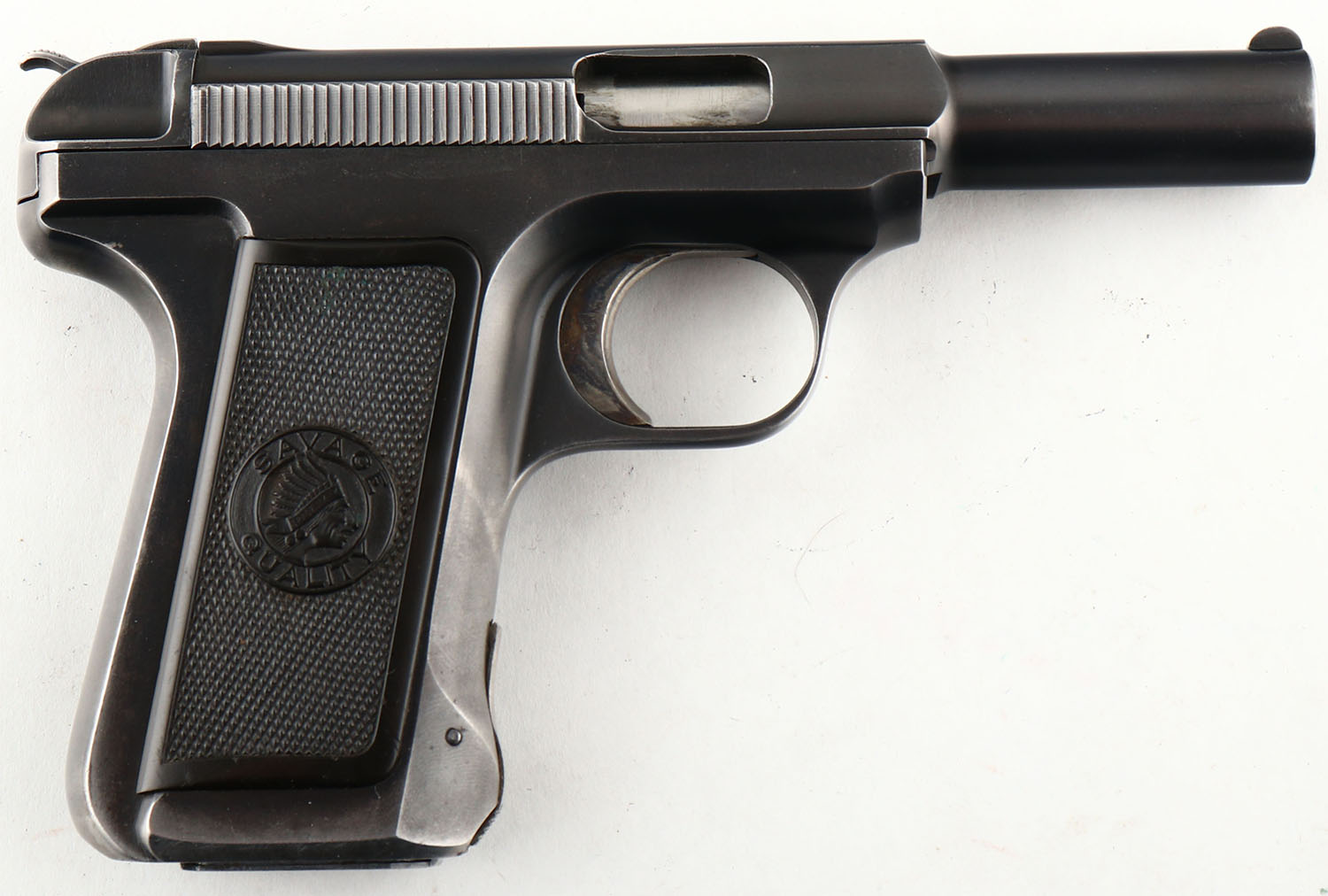 Savage, Model 1907, CAL: 32, MFG: 1920, SN: 225233, Semi Auto Pistol, 3 3/4'' barrel. The original Savage checkered hard rubber grips are excellent. The original blued finish rates 95% on the barrel/slide & 75% on the frame, with concentrated wear to the grip/straps. Bore is very good & bright, slightly hazy. Integral notch rear sight & low profile blade front sight. FFL or C&R Req. - Value: 300 to 500