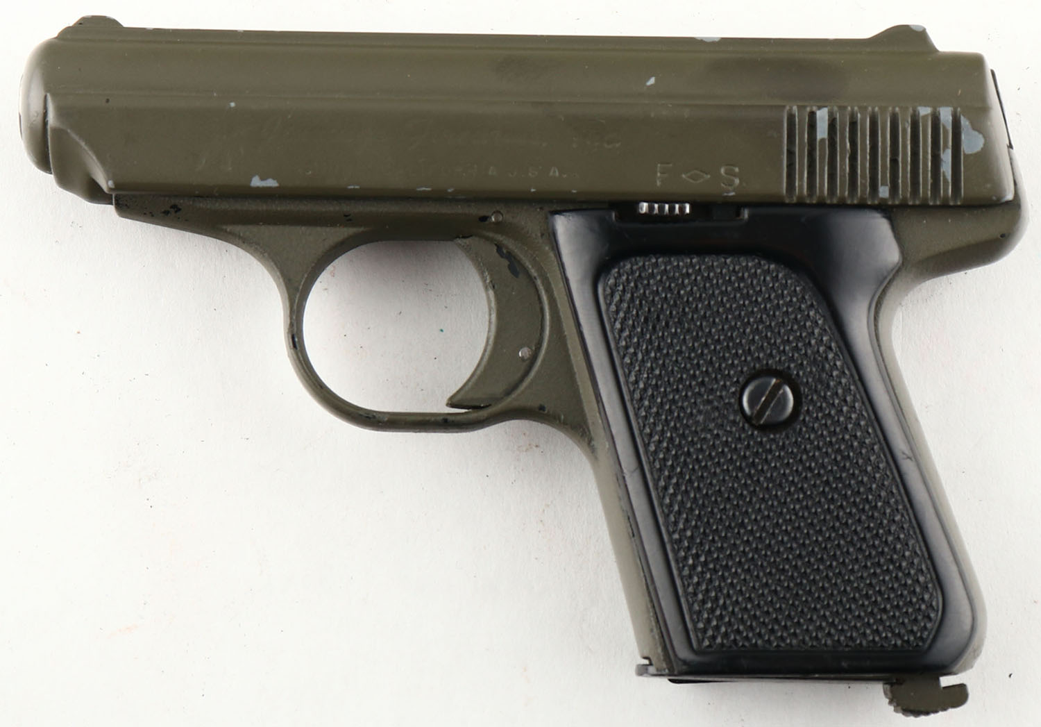 Jennings, J-22, CAL: 22LR, MFG: 1978-Present, SN: 077809, Semi Auto Pistol, 2 1/2'' barrel. The checkered synthetic grips are very good & solid, with visible light wear. There are minor scrapes & dings. The applied matte gray/green finish rates 90% overall, with some flaking. Bore is very good, bright, with visible wear from use. Fixed square notch rear sight & low profile blade front sight. FFL Req. - Value: 50 to 100