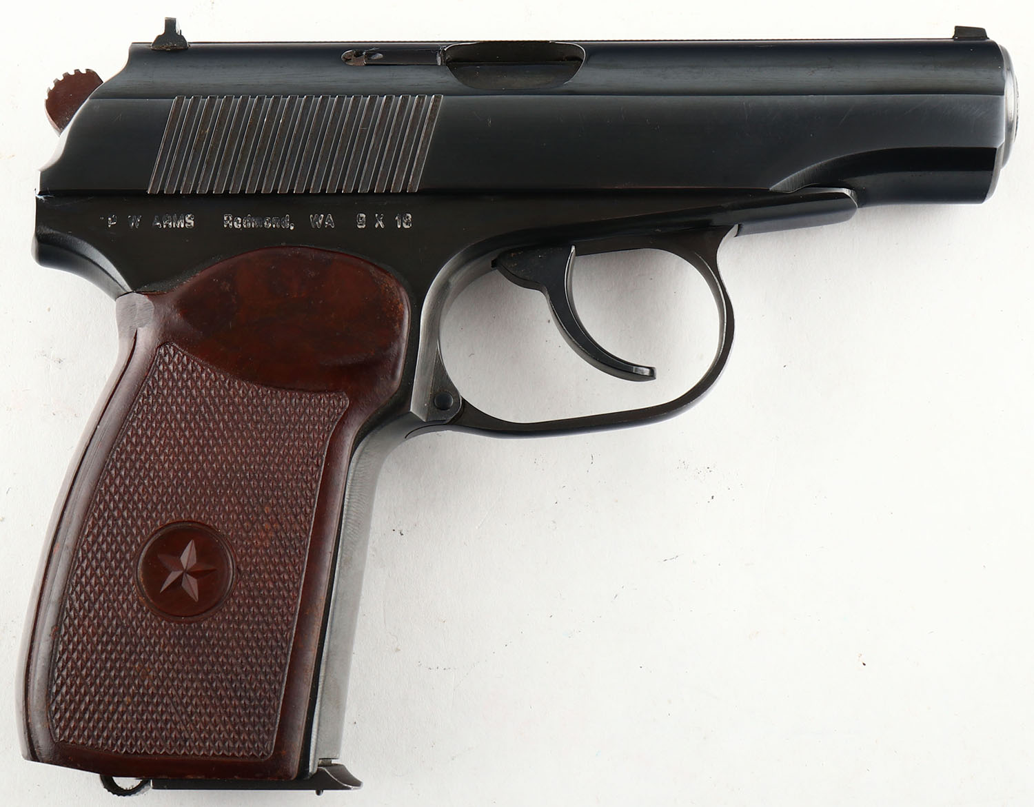 Bulgarian (Factory 10), Makarov, CAL: 9x18 MAKAROV, MFG: 1971, SN: BE191536, Semi Auto Pistol, 3 5/8'' barrel. Factory markings on left side & import marks on the right side. The original checkered plastic grips are very good & solid. There are contusions, dings & overall light wear. The blued finish rates 95% overall. Bore is excellent. Fixed square notch rear sight & blade front sight. Comes with reproduction leather holster & (2) extra mags. FFL or C&R Req. - Value: 300 to 600