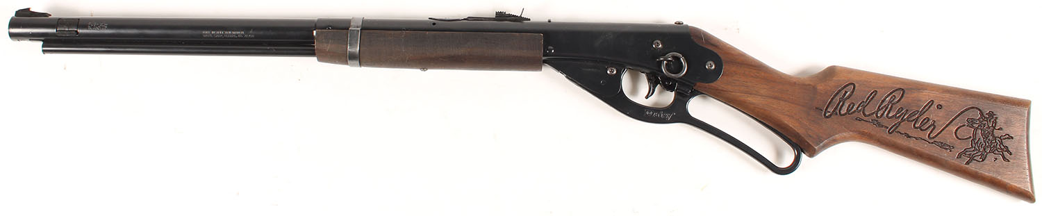 Daisy Model 1938B ''Red Ryder'' 1938-1988 Special edition Saddle Ring Carbine Lever BB/.175 rifle, MFG 1988. The original wood stocks are excellent, with minor use marks, no visible cracks. No buttplate. Black painted metal finish is excellent, Original sights. Excellent lever action compression. Safety behind trigger. Appearance & function is excellent overall. - Value: 20 to 40