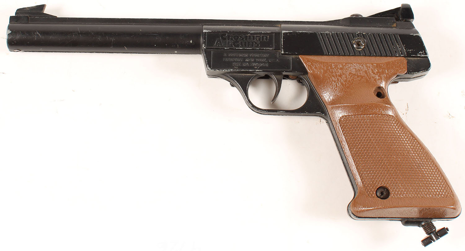 Crosman Airguns, Model 1600 Powermatic BB, Cal: BB, S/N: 586367652, takes CO2 canisters, checkered brown plastic grips, cast metal frame with a steel barrel insert. Grade: Very Good ++ - Value: 40 to 80