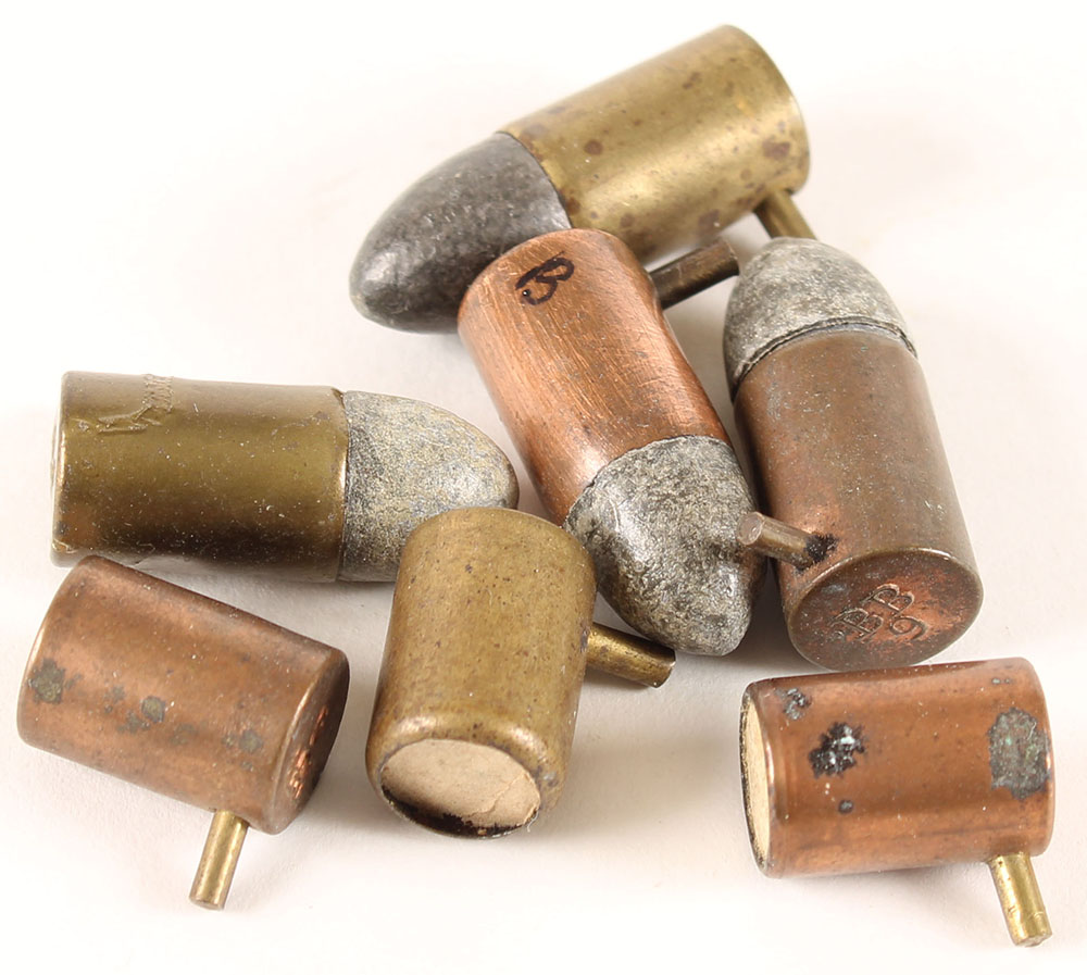 Lot of 7. 9mm Pinfire. (4) Ball by ''BB'', SB, ELEY, & chicken. (3) Blanks by ELEY, SB, and unknown. All with rolled crimp over tan wad. Grade Very Good - Value: 20 to 40