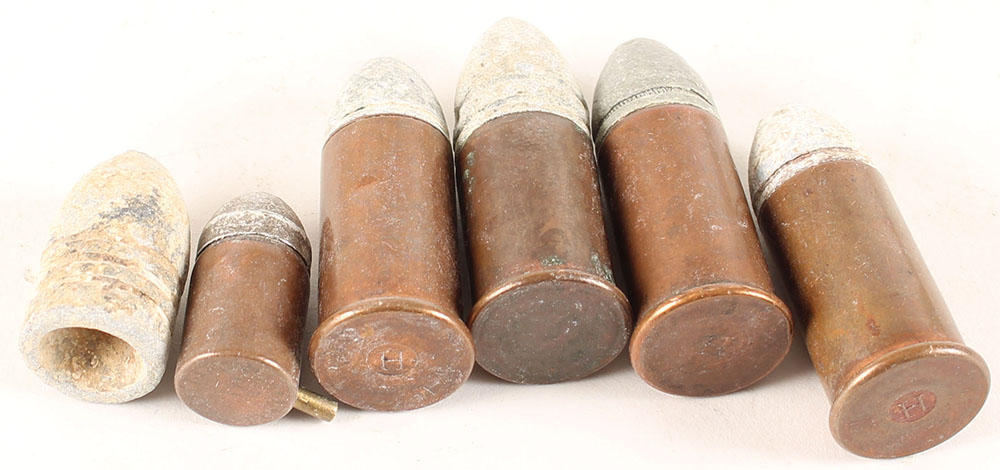 Lot of 5. (3) 52-50 Spencer Rimfire. HS:''H'' raised. FN Lead. (1) 56-56 Spencer Rimfire, NHS, PT Lead. (1) 11mm Pinfire, HS:''FUSNOT'' raised and very faint, RN Lead. (1) .58 projectile, Battlefield dug-up. Bullets are frosty but otherwise Grade Very Good - Value: 30 to 60