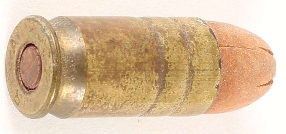 EXPERIMENTAL .45 ACP SHOT, H/S R A 43, 1st cannelure is smooth and 2nd is knurled, time on has the short paper sabot to fit the 1911 mag, this was experimentally made to fire through the magazine of the 1911 pistol, OAL 1.29, flat copper primer, purple primer sealent. Grade: Excellent - Value: 60 to 120